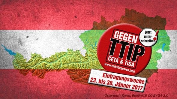 Í dag, þann 23. janúar hefst í Austurríki með hinni svonefndu innritunarviku, mikilvægur kafli þjóðarkröfu gegn TTIP, CETA og TiSA. Viðræður um fríverslunarsamninginn TTIP milli USA og ESB hafa farið fram frá 2013 og alltaf bak við luktar dyr, sem þýðir á venjulegu máli: markvisst án opinberrar umræðu. CETA er hinsvegar samkomulag sem nú þegar ríkir milli ESB og Kanada. TiSA kemur reglu á þjónustuviðskiptin og nú standa viðræður yfir milli 23 landa, þar á meðal USA og Evrópusambandsins.
