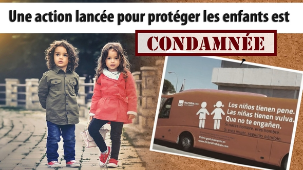 En Espagne l’enseignement de l’éducation sexuelle pour les enfants d’école maternelle et primaire est obligatoire d’après la loi, parce que l’influence du lobby LGBTI s’étend jusqu’aux cercles gouvernementaux. Cela a pour conséquence que des intervenants extérieurs LGBTI donnent des cours « pratiques » de sexualité et d’identité du genre dans les écoles, sans le consentement des parents. A cela s’ajoute une campagne d’affichage très provocante montrant dans un dessin les enfants nus et mettant en question leur identité sexuelle naturelle. Cela a provoqué la réaction de l’organisation des droits de l’homme HazteOir à qui cependant on a refusé une contre-campagne sous forme d’une action d’affichage. Ils ont donc fait circuler à travers les villes un bus de couleur orange vif avec des dessins très clairs et le titre « Ne vous laissez pas embrouiller ! » Tout d’abord avec un succès très convaincant ! Malgré une opposition massive de la part du lobby LGBTI, des autorités, des juges, des médias, le bus a circulé à travers de nombreuses villes d’Espagne et l’action gagnait les cœurs de la population. Malgré cela le procureur de la République à Madrid a introduit contre HazteOir.org une procédure d’examen pour incitation à la haine et le bus a été stoppé par les autorités de sécurité. Qui se cache là-derrière quand d’une part des campagnes d’affichage présentant des enfants nus et favorisant la pédophilie, sont exécutées de façon radicale, alors qu’en même temps des contre voix légitimes pour la protection de ces enfants mènent à l’accusation judiciaire d’incitation à la haine ?