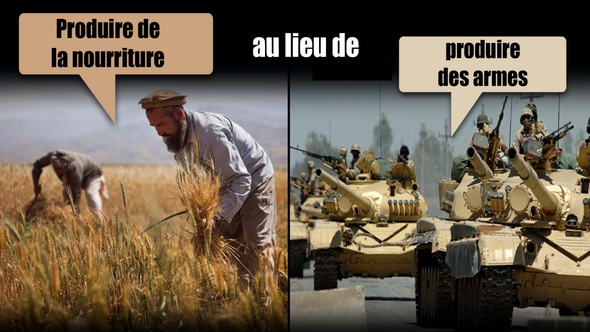 Selon certaines estimations, il y a 1,4 milliard de personnes qui vivent dans une pauvreté extrême, dont environ 0,8 milliard qui sont sous alimentées, c'est-à-dire qu’une personne sur neuf souffre de la faim TOUS les jours ! Si on voulait donner chaque jour 1 dollar à ces 1,4 milliard de personnes, ce serait largement suffisant contre la faim ; annuellement on aurait besoin de 500 milliards de dollars. Si on compare cette somme avec les dépenses militaires annuelles au niveau mondial, ces dernières sont 3 fois plus élevées (environ 1 700 milliards de dollars) ! Si on économisait 1 tiers des dépenses militaires, il y aurait donc assez d’argent disponible pour les personnes qui souffrent de la faim. Et cela pas seulement pour la livraison des denrées alimentaires, mais également pour leur culture. Par conséquent, il serait absolument possible de stopper la faim dans le monde si on acceptait de « Produire de la nourriture au lieu de produire des armes ».
