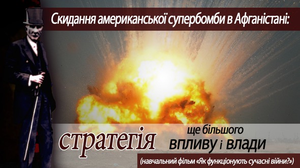 14 квітня 2017 року ЗМІ повідомили, що збройні сили США вперше скинули свою наймогутнішу неатомну бомбу під час бойового нальоту в Афганістані. Бомбу типу GBU-43/B також називають „MassiveOrdnanzeAirBlast“ (массів орднанс ейр бласт) (MOAB) «важкий боєприпас фугасної дії» або «Мати всіх бомб». Вона містить вісім тонн вибухівки з радіусом вибуху в 150 метрів і коштує 16 мільйонів доларів США кожна! Під час нападу був повністю зруйнований важливий командний центр армії терористів Ісламської держави (ІД), – повідомило афганське Міністерство оборони. Бомба зруйнувала 300-метровий тунель і вбила 94 бійців, що належать нібито ІД. Цивільне населення не постраждало. Старійшини повідомили, що афганські з'єднання ще перед скиданням бомби вивезли останніх жителів. ІД спростувало повідомлення про те, що під час нальоту загинули або були поранені бійці терористичного угруповання. Військове значення бомби заперечується. Через її величину і величезну ударну хвилю вона, перш за все, служить для психологічного ведення війни. Командувач підрозділами США в Афганістані генерал Джон Ніколсон виправдав застосування бомби тим, що це « боєприпас, який підходить» для того, щоб знешкодити заміновані оборонні позиції ІД. Президент США Дональд Трамп говорив про «дуже, дуже успішну» операцію. На питання, чи задумано застосування бомби як попередження для Північної Кореї, Трамп відповів, що в цьому немає ніякої різниці. Цитую: «Я не знаю, чи цим посилається вістка. Але це й байдуже, чи є вона для цього, чи ні. Північна Корея – це проблема. Але проблема буде вирішена». Чому ж збройні сили США застосовують саме зараз свою найпотужнішу неядерну бомбу проти ІД, яка з'явилася в Афганістані лише в 2015 році і мала там не більше 3000 бійців? Пояснення імперіалістичної військової стратегії дає нам навчальний фільм «Як функціонують сучасні війни?». У ньому показано, як так званому агресору вдається послаблювати і призводити до абсолютного хаосу цілі країни і регіони, котрі взяті за мету. Після цього він грає роль «спасителя» і перемагає всіх своїх найсильніших суперників. Нападника можна прирівняти до «імперії». В історії людства все знову здійснювалися такі напади державами, які представляли собою імперію. Вони деякий час були сильнішими і впливовішими, ніж інші. Швейцарський історик і дослідник проблем миру доктор Даніеле Ганзер вживає назву «Імперія США», щоб вказати на реальне співвідношення сил з 1945 року. США є найбільшою економічною силою,яка випереджає Китай, мають у розпорядженні світову резервну валюту і можуть самі її друкувати, ─ говорить доктор Ганзер. У військовому відношенні США мають велику перевагу зі своїми 700 військовими базами, щонайменше, в 42 країнах. Росія, навпаки, утримує 30 військових баз у 9 країнах. На показаній карті російські бази позначені червоним, а американські синім кольором. https://www.siper.ch/de/assets/uploads/files/diagrams/SIPER%20rafik%20Militaerstuetzpunkte%20Ruslands%20und%20der%20USA.pdf За словами Даніеле Ганзера, імперії часто намагалися використовувати свої позиційні сили, щоб досягти ще більшого впливу і влади. Саме цю стратегію досягнення ще більшого впливу і влади розкриває навчальний фільм «Як функціонують сучасні війни?». Ключову роль при цьому відіграють різні найманці або терористичні угруповання, які агрессор оснащує, фінансує і інструменталізує. Так, відомо, що «ісламістська» терористич