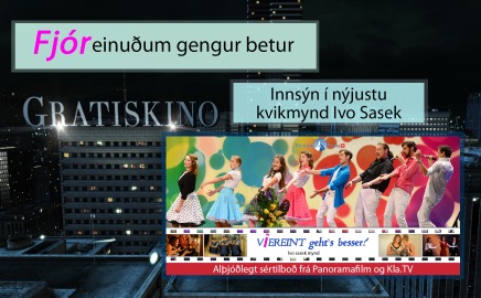 Allir eru að tala um veðrið. Ekki við. Við tölum um fríbíó. Og það umsvifalaust, að minnsta kosti næstu átta vikurnar – og það í næsta nágrenni. Á bak við slíkt átak er sem fyrr stofnandi Kla.TV: Ivo Sasek. Hin frábæra nýjusta kvikmynd hans „Fjóreinuðum gengur betur“ var frumsýnd þann 7. júlí síðastliðinn. Í hana hefur verið lögð mikil ást og alúð. Kíkið og sannfærist! Því hvorki hasar einn og sér og fallegar myndir breyta þessum heimi – heldur gæði sem ná til hjartans. Til umhugsunar: Ég fann mjög áhugaverðar hliðstæður: Og það var ekki bara passinn hans Ahmeds sem fannst á vettvangi hryðjuverkanna: Þann 11. september 2001 þegar báðir turnarnir í New York urðu að dufti: Nei! Kvikmynd stútfull af húmor, spennu, krafti, styrk ... og rómantík. Og enn og aftur: Ivo Sasek áttaði sig á að „Ekkert er ómögulegt!“ og sýnir nú nýjustu bíómyndina sína í nokkur hundruð úti- eða heimabíóum, sem ókeypis sýningu á silfurtjaldi. Ókeypis fyrir hvern? Auðvitað fyrir alla Kla.TV- áhorfendur og þá sem vilja kynnast okkur betur og jafnvel vinna á einhvern hátt með okkur í framtíðinni. Þar sem um er að ræða sérstakt átak frá Panorama Film og Kla.TV þá þarft þú bara að láta okkur vita hvar í Evrópu þú ert staðstettur, nú eða hvar í heiminum þú vilt sjá myndina og við leiðbeinum þér þangað sem er í sem nágrenni við þig. Skráðu þig á netinu á www.kla.tv/gratiskino eða smelltu beint á krækjuna neðst í útsendingunni. Njóttu örstiklunnar „Fjóreinuð gengur betur“ og að sjálfsögðu - sjáumst sem fyrst- Okkur hlakkar til að sjá þig! Okkur var ráðið frá ferð til þessa óörugga lands, en sá sem þekkir ögn til, veit að við erum hérna – auðsagt – laus við sprengjur ... Nemið staðar! Hey þið, stoppiði! Stoppið! Upp með hendur, sagði ég! Segðu til nafns! Segðu til nafns! Ahmed. En hér stendur Mohammed. Þetta er heldur ekki mín skilríki. Ég var bara að finna þau. Aha, ... einmitt hérna ... það geta allir sagt, þessi hérna er samt býsna líkur þér. Aha, Kvikmynd með aðalleikurunum Joshua og Anna-Sophia SASEK, sem léku í „Hetjur deyja á annan veg“, „Sophie og sértrúarsséffinn“, „Karma, ég kem aftur“ og „Mönnum stelur maður ekki“ aðalleikaranum Pascal ZIMMERMANN úr kvikmyndinni „Í upphafi var hjartað.“ og aðalleikaranum Joas BÜHLER úr myndinni „Mönnum stelur maður ekki“ söngkonunum Caroline ANTONI, Kezia JETTER, stjörnustjórnandanum Ruth SASEK og söngvara- og gítarleikaranum Mike PULLMANN Nær þessi mynd að verða framhaldsmynd? Misstir þú af frumsýningunni? Þá er fríbíó nákvæmlega næsta tækifæri til þátttöku. Skráðu þig undir: www.kla.tv/gratiskino