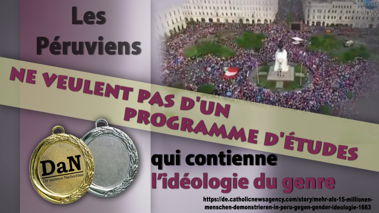 Les Péruviens ne veulent pas d'un programme d'études qui contienne l’idéologie du genre. Malgré les nombreuses critiques, le ministère péruvien de l’Enseignement a donné son accord fin 2016 pour un nouveau plan d’enseignement pour 2017 avec l’intégration de l’idéologie du genre. En mars 2017, des parents, des associations d’enseignants et l’église catholique ont organisé des marches de protestation sous le slogan « Ne touche pas à mes enfants ! ». 1,5 million de personnes ont participé à ces manifestations pendant plusieurs mois ; cela a été un véritable succès. En novembre 2017, le ministère de l’Education a fait savoir qu’il remettait en place le plan d’enseignement de 2009, sans le contenu de l’idéologie du genre. Ce succès dû au mouvement de protestations pourrait devenir un encouragement pour tous ceux qui ne veulent pas regarder passivement l’idéologie du genre entrer dans les écoles.