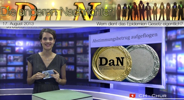 Heute dürfen wir Sie mit einer DaN Nachricht begrüssen, denn heute werden wir mit einem Mann sprechen, der einen gewichtigen Fehler im Schweizer Abstimmungsbüchlein im Bezug auf das neue Epidemiengesetz entdeckte und es auch publik machte! Ein Bravo an Herr Eberhart, dass er da aufgestanden ist und an vordersten Front mitkämpft, um dieses Bevormundungsgesetz zu verhindern. Ein weiteres Bravo an ihn auch dafür, dass er sich nicht gescheut hat, das ganze Gesetz eingehend zu studieren und dadurch auch Ihnen, werte Zuschauer kompetent darüber Auskunft geben kann. Bevor wir nun aber in das Geschäft des Drogisten und BDP- Grossrates Peter Eberhart umschalten, erinnern wir nochmals vorgängig, um was es in dieser Abstimmung geht und was es mit dem Fehler in dem Abstimmungsbüchlein auf sich hat. Am 22. September stimmt das Schweizerstimmvolk über das revidierte Epidemien Gesetz ab. Mit der Revision soll das alte Epidemien Gesetz aus dem Jahr 1970 ersetzt werden. Die Schweiz soll sich damit besser wappnen können gegen übertragbare Krankheiten. Der Bundesrat schreibt im Abstimmungsbüchlein, dass der Verband der Drogistinnen und Drogisten das Epidemien Gesetz (EpG) unterstütze. Doch dies entspricht nicht der Wahrheit, denn der Verband hatte gar keine Parole gefasst. Zum besseren Verständnis für unsere deutschen und österreichischen Zuschauerinnen und Zuschauer ist noch zu erwähnen, dass in der Schweiz Drogisten Fachleute in der Gesundheitsbranche sind. Sie sind in der Bevölkerung gut angesehen und ihre Meinung hat auch Einfluss auf das Stimmverhalten der Bevölkerung. Nun sind wir gespannt, was uns Peter Eberhart, Drogist und BDP-Grossrat berichtet und schalten um nach Erlenbach in Bern! Hier folgt das Interview. Ja, auch wir aus dem Studio Chur wünschen das Herr Eberhard. Wir bedanken uns für das interessante Interview. Liebe Zuschauerinnen und Zuschauer, Mit einem Ja zum Epidemie Gesetz übergeben wir dem Bundesamt für Gesundheit, Entscheidungsgewalt über unser Leben! Das BAG wird sich wiederum nach den Empfehlungen der WHO richten. Diese hat sich jedoch unlängst bei der sogenannten Schweinegrippe als sträflich-verfehlt erwiesen! Mit dem neuen EpG wird die Bundesverfassung ausgehebelt und wir geben unsere Entscheidungsfreiheit ab. An dieser Stelle möchten wir auch darauf hinweisen, dass der im neuen EpG enthaltene Impfzwang in den Medien vertuscht und abgeschwächt wird. In der Botschaft zu Gesetz steht unter Punkt 3.3.1. eindeutig, dass auch Zwangsgewalt angewendet werden soll, wenn es die Situation verlangt: „Bei der Verhütung und Bekämpfung von übertragbaren Krankheiten gibt es Situationen, in welchen die verfassungsmässig geschützten Grundrechte des Einzelnen beschränkt werden müssen. Hierbei kann die Anwendung von Zwangsgewalt erforderlich werden. Die Anwendung von Zwangsgewalt ist im Sinne eines Gewaltmonopols in der Schweiz allein ausgewählten Organen des Staates vorbehalten.“ Sagen sie es weiter und helfen sie uns mit, diese Informationen zu verbreiten. Der Medien Kommentar vom 8.August 2013 zeigt anschliessend an das Interview, noch die Unterschiede, vom alten zum neuen Epidemie Gesetz auf . Und vergessen sie nicht, liebe Schweizer Stimmbürgerinnen und Stimmbürger: Es braucht uns alle an der Urne, damit dieses Gesetz nicht zustande kommt! Also: Nein zum revidierten Epidemien Gesetz am 22. Sept. 2013.