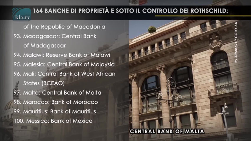 La lista delle banche in possesso e sotto il controllo dei Rothschild: Un numero sempre maggiore di persone comincia a capire che il 99% della popolazione mondiale è controllata da un’élite della percentuale rimanente – ma chi controlla questa élite dell'1%? È solo una teoria cospiratoria a rifilare questo ruolo alla famiglia Rothschild? Perché la famiglia Rothschild dovrebbe letteralmente dominare tutto, persino l'1% di élite. Consideriamo quindi questa ipotesi alla luce della seguente lista – perlomeno questa lista dovrebbe essere inconfutabile: Sono documentate solo le banche in possesso e sotto il controllo dei Rothschild. Allacciate le cinture e via .... 164 banche di proprietà e sotto il controllo dei Rothschild: 1. Albania: Bank of Albania 2. Algeria: Bank of Algeria 3. Antille Olandesi: Bank of the Netherlands Antilles 4. Arabia Saudita: Saudi Arabian Monetary Agency 5. Argentina: Central Bank of Argentina 6. Armenia: Central Bank of Armenia 7. Aruba: Central Bank of Aruba 8. Australia: Reserve Bank of Australia 9. Austria: Oesterreichische Nationalbank 10. Azerbaigian: Central Bank of Azerbaijan Republic 11. Bahamas: Central Bank of The Bahamas 12. Bahrain: Central Bank of Bahrain 13. Bangladesh: Bangladesh Bank 14. Barbados: Central Bank of Barbados 15. Belgio: National Bank of Belgium 16. Belize: Central Bank of Belize 17. Benin: Central Bank of West African States (BCEAO) 18. Bermuda: Bermuda Monetary Authority 19. Bhutan: Royal Monetary Authority of Bhutan 20. Bielorussia: National Bank of the Republic of Belarus 21. Bolivia: Central Bank of Bolivia 22. Bosnia: Central Bank of Bosnia and Herzegovina 23. Botswana: Bank of Botswana 24. Brasile: Central Bank of Brazil 25. Bulgaria: Bulgarian National Bank 26. Burkina Faso: Central Bank of West African States (BCEAO) 27. Burundi: Bank of the Republic of Burundi 28. Cambogia: National Bank of Cambodia 29. Camerun: Bank of Central African States 30. Canada: Bank of Canada – Banque du Canada 31. Caraibi Orientali: Eastern Caribbean Central Bank 32. Ciad: Bank of Central African States 33. Cile: Central Bank of Chile 34. Cina: The People’s Bank of China 35. Cipro: Central Bank of Cyprus 36. Colombia: Bank of the Republic 37. Comore: Central Bank of Comoros 38. Congo: Bank of Central African States 39. Corea: Bank of Korea 40. Costa d'Avorio: Central Bank of West African States (BCEAO) 41. Costa Rica: Central Bank of Costa Rica 42. Croazia: Croatian National Bank 43. Cuba: Central Bank of Cuba 44. Danimarca: National Bank of Denmark 45. Ecuador: Central Bank of Ecuador 46. Egitto: Central Bank of Egypt 47. El Salvador: Central Reserve Bank of El Salvador 48. Emirati Arabi Uniti: Central Bank of United Arab Emirates 49. Estonia: Bank of Estonia 50. Etiopia: National Bank of Ethiopia 51. Figi: Reserve Bank of Fiji 52. Filippine: Bangko Sentral ng Pilipinas 53. Finlandia: Bank of Finland 54. Francia: Bank of France 55. Gabon: Bank of Central African States 56. Gambia: Central Bank of The Gambia 57. Georgia: National Bank of Georgia 58. Germania: Deutsche Bundesbank 59. Ghana: Bank of Ghana 60. Giamaica: Bank of Jamaica 61. Giappone: Bank of Japan 62. Giordania: Central Bank of Jordan 63. Grecia: Bank of Greece 64. Guatemala: Bank of Guatemala 65. Guinea Equatoriale: Bank of Central African States 66. Guinea-Bissau: Central Bank of West African States (BCEAO) 67. Guyana: Bank of Guyana 68. Haiti: Central Bank of Haiti 69. Honduras: Central Bank of Honduras 70. Hong Kong: Hong Kong Monetary Authority 71. India: Reserve Bank of India 72. Indonesia: Bank Indonesia 73. Iran: The Central Bank of the Islamic Republic of Iran 74. Iraq: Central Bank of Iraq 75. Irlanda: Central Bank and Financial Services Authority of Ireland 76. Islanda: Central Bank of Iceland 77. Isole Cayman: Cayman Islands Monetary Authority 78. Isole Salomone: Central Bank of Solomon Islands 79. Israele: Bank of Israel 80. Italia: Banca d'Italia 81. Kazakistan: National Bank of Kazakhstan 82. Kenya: Central Bank of Kenya 83. Kirghizistan: National Bank of the Kyrgyz Republic 84. Kuwait: Central Bank of Kuwait 85. Lesotho: Central Bank of Lesotho 86. Lettonia: Bank of Latvia 87. Libano: Central Bank of Lebanon 88. Libia: Central Bank of Libya (loro ultima conquista) 89. Lituania: Bank of Lithuania 90. Lussemburgo: Central Bank of Luxembourg 91. Macao: Monetary Authority of Macao 92. Macedonia: National Bank of the Republic of Macedonia 93. Madagascar: Central Bank of Madagascar 94. Malawi: Reserve Bank of Malawi 95. Malesia: Central Bank of Malaysia 96. Mali: Central Bank of West African States (BCEAO) 97. Malta: Central Bank of Malta 98. Marocco: Bank of Morocco 99. Mauritius: Bank of Mauritius 0.Messico: Bank of Mexico 1.Moldavia: National Bank of Moldova 2.Mongolia: Bank of Mongolia 3.Montenegro: Central Bank of Montenegro 4.Mozambico: Bank of Mozambique 5.Namibia: Bank of Namibia 6.Nepal: Central Bank of Nepal 7.Nicaragua: Central Bank of Nicaragua 8.Niger: Central Bank of West African States (BCEAO) 9.Nigeria: Central Bank of Nigeria 1.Norvegia: Central Bank of Norway 111.Nuova Zelanda: Reserve Bank of New Zealand 112.Oman: Central Bank of Oman 113.Paesi Bassi: Netherlands Bank 114.Pakistan: State Bank of Pakistan 115.Papua Nuova Guinea: Bank of Papua New Guinea 116.Paraguay: Central Bank of Paraguay 117.Perù: Central Reserve Bank of Peru 118.Polonia: National Bank of Poland 119.Portogallo: Bank of Portugal 120.Qatar: Qatar Central Bank 121.Regno Unito: Bank of England 122.Repubblica Ceca: Czech National Bank 123.Repubblica Centrafricana: Bank of Central African States 124.Repubblica Dominicana: Central Bank of the Dominican Republic 125.Romania: National Bank of Romania 126.Ruanda: National Bank of Rwanda 127.Samoa: Central Bank of Samoa 128.San Marino: Central Bank of the Republic of San Marino 129.Senegal: Central Bank of West African States (BCEAO) 130.Serbia: National Bank of Serbia 131.Seychelles: Central Bank of Seychelles 132.Sierra Leone: Ban