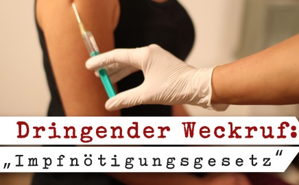 Helfen Sie durch diese Weiterverbreitung mit, dass auch Ihr unmittelbares Umfeld durch diesen Weckruf alarmiert wird. So kann eine öffentliche Gegenbewegung gegen dieses „Impfnötigungsgesetz“ entstehen, denn niemand darf gegen seinen Willen zu einer Impfung gezwungen oder genötigt werden!