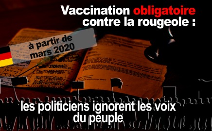 Le 14 novembre 2019 en Allemagne, l’obligation de vaccination redoutée contre la rougeole a été décidée. Des voix critiques, comme celle de Hans Tolzin, les objections et les avertissements alarmants ont été ignorés par la plupart des politiciens. Une fois de plus, la population doit en subir les conséquences.[lire la suite]