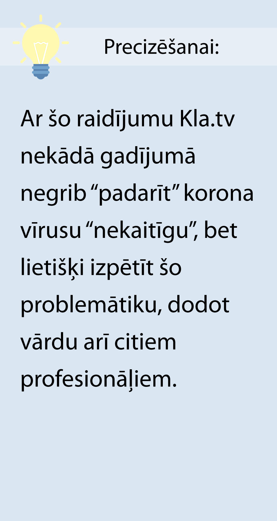 Valstu robežas pārsniedzošie pasākumi korona vīrusa infekcijas sakarā kļūst arvien drastiskāki un ierobežojošāki. Ziemeļitālija jau gabdrīz pilnīgi atrodas zem karantīnas. Ķīnā, iespējamās infekcijas pārnešanas dēļ, tiek izņemta skaidrā nauda. Visi pasākumi un statistika, galu galā, pamatojas tikai uz ar korona vīrusu inficēto un no tā mirušo skaitu. Līdz ar to, corona vīrusa konstatēšanas testam ir liela nozīme. Šī testa rezultātam ir ekstrēma nozīme attiecībā uz veselības pasākumiem, brīvību, ekonomiku un uz finansēm. Jo tostarp, no testa rezultātiem ir atkarīgi arī piespiedus pasākumi un rīcība ar slimnieku. Tādēļ būtu jāpieņem, ka šie testi ir sevišķi rūpīgii un precīzi. Bet, vai tā arī ir? Paņemsim šos testus “zem lupas”: 1. Kas vispār tiek testēti? To izvērtē ārsts, jo ne jau ikviens, kuram ir iesmas un klepus, ir inficēts ar korona vīrusu. Kam ir izteiktas pazīmes, kā klepus, drudzis un elpas trūkums vai “neskaidras izcelsmes” vīrusu pmeimonijas pazīmes vai, kam ir bijis kontakts ar inficētu personu, vai kas ir uzturējies kādā no riska zonām – tie visi ir uzskatāmi par pamatoti aizdomīgiem. Pēc Roberta Koha institūta (RKI), piedevām arī pacienti ar gripas simptomiem tiek izlases veidā testēti uz korona vīrusu. 2. Kā tiek testēts? Pacientam tiek noņemta rīkles gala vai rīkes - deguna dobuma uztriepe. Daļēji tiek izmantots arī no bronhiem izklepotais sekrēts. Tur meklē noteiktus korona vīrusu RNS (ribonukleīnskābes) gēna gabaliņus. Tā kā noteikšanai šī parauga nepietiek, tad to vairākkārt daudzkāršo. Tas tiek darīts ar Polimerāzes ķēdes reakcijas (angl. – Polymerase Chain Reaction) metodi, ko īsi sauc par PCR. Tas rada zināsmu “asuma izplūšanu”. Daudzkāršotā testējamā materiāla analīzei būtu jāuzrāda, vai meklētā korona vīrusa gēnu sekvence paraugā ir atrodama vai nav. 3. Kādi tieši ir šie PCR-testi? Pēc “Chinese Academy of medical Sciences” prezidenta Wang Chena, korona vīrusa noteikšanas testa precizitāte jeb jūtīgums esot no 30 līdz 50 %. Tests atpazīstot tikai katru otro vai trešo inficēto. Bet liela kļūdas iespēja pastāv ne tikai, nosakot inficētos – tāpat arī ļoti daudzi veselie tiek kļūdaini uzrādīti kā inficēti ar korona vīrusu. Tad šos cilvēkus, uz viltus pozitīvā testa pamata, ārstē nepareizi, un pie tam, viņi stipri paaugstina statistikas inficēto skaitu. Pēc kāda nesena pētījuma no 2020. gada 5. marta, ir secināts, ka četri no pieciem testētajiem ir bijuši viltus pozitīvi, tas ir – 80% ir noteikti kā viltus pozitīvi. Pēc BBC ziņām, vairākās zemēs pacienti ir testēti līdz 6 reizēm, ja rezultāts ir bijis korona-negatīvs, kamēr 7. reizē tomēr iznācis – korona-pozitīvs. Tātad, tur tika testēts tik ilgi, kamēr dabūja vēlamo pozitīvo rezultātu. 4. Vai šie PCR testi atbilst tādam uzdevumam - lai izteiktos par Korona vīrusu? Infektoloģe, prof. Izabella Eckerle, Genfas Universitātes Virusoloģijas Centra vadītāja, norāda uz to, ka korona vīrusu noteikšanai izmantotie testi pierāda tikai vīrusu gēnu materiāla klātesmi, bet neko neizsaka par “infekciozi aktīvo” vīrusu esamību vai skaitu. Pat Kary B. Mullis, kas ir radījis šo PCR testu, un kas 1993. gadā par to saņēma Nobela prēmiju ķīmijā, uzskata, ka PCR tests nev derīgs vīrusu identificēšanai. Kopsavilkums: Visa mediju kņada (hype) ap šo korona vīrusu, visi piespiedus pasākumi un to izraisītā panika, galu galā, pamatojas tikai uz apšaubāmu testu rezultātiem. Tas ir biedējoši – izskatās, ka šo testu rezultātiem tik akli uzticas. Nākamās nedēļas parādīs, vai bailes un ekstrēmie pasākumi šī korona vīrusa dēļ būs bijuši pamatoti, va arī – kādus slepenus mērķus ar to visu būs gribēts sasniegt. Abonējiet mūsu “Newsletter”, lai Jūs neizlaistu nevienu turpmāko raidījumu par šo. Visu citu informāciju par korona vīrusu Jūs atradīsiet uz https://www.kla.tv/corona