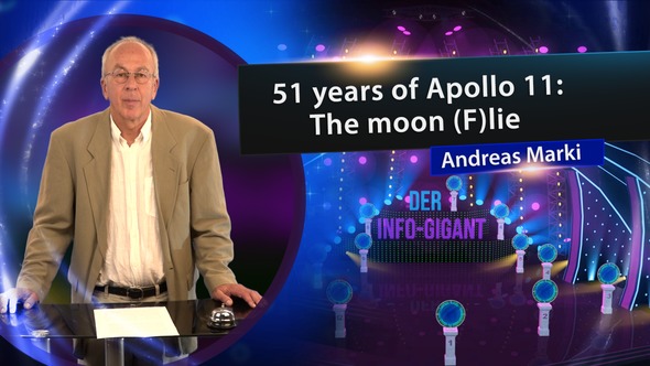 Our today's information giant: Andreas Märki holds a degree in engineering from the Swiss Federal Institute of Technology Zurich and has worked for over 20 years in the Swiss space industry: So today a competent voice speaks on the subject: 50 years of Apollo 11: The moon (F)lie I am talking about the official first moon landing in 1969 by Apollo 11. The boys and girls who stage such deceptions are obviously number fetishists. One of their favourite numbers seems to be 11. That's why I present here 11 pillars. Why boys and girls? Are there men and women in it? I don't know, but to express myself in a gender-conform way, I speak of boys and girls. So, no one need feel left out. Let's go. Yeah, I'm ready, we're good to go. 1) The Apollo moon landings are considered one of the greatest technical achievements of the last century. How did such a moon landing take place and how many moon landings are said to have taken place? What is the official history of this? In 1962, Kennedy announced the goal of landing a man on the moon and returning him safely back to earth within the same decade. The United States launched a space program. First, they flew with small space capsules with only one astronaut, then with two-seaters, with which they additionally practiced manoeuvring, in order to fly to the moon with 3 astronauts at the end. In the moon orbit the lunar lander module uncoupled itself with 2 astronauts and landed on the moon. The two astronauts got out, took photos, got back in, and took off from the Moon and flew back to the space capsule, which was still orbiting the Moon and where their colleague was waiting. From there they went back to Earth and they landed in the sea. There were six successful moon landings in the years 1969-72; a seventh, Apollo 13, did not land on the moon due to a defect. After an orbit around the Moon, the crew returned to Earth safely. 2.) These moon landings are still controversial today. According to surveys, why do 30-50% of the population question the moon landings, although they are presented by the mass media as a secured historical event? Two points: First: As fast as space technology was developed for the moon landings, it collapsed again. Its rockets and space capsules went straight into the museum instead of being used again. Secondly: The images that the astronauts claim to have taken on the lunar surface every minute with viewfinderless cameras are far too perfect in terms of image quality and composition. In addition, some images have unnatural features. Emotionally, the viewer then notices that something is wrong, but his attention is repeatedly drawn to details such as a waving flag or possibly missing stars, so that he can no longer see the forest for the trees. The mind can be distracted in this way, but the bad feeling remains. The answer from the gut is then "The moon landings are fake". 3.) What is the most illustrative example that the moon landing of Apollo 11 in 1969 was faked? In the picture with astronaut Aldrin at the lunar module, the end of the shadow coincides with the end of the moon. If one readjusts the image, one has to cover the background to get the same horizon. This gives rise to the suspicion that the photos were taken in a studio, where one can only see to the end of the illuminated floor and behind it a black wall marks the universe. This suspicion then becomes a certainty in live video: the camera is at Aldrin's head height and you look down on the horizon as steeply as is not possible in a real landscape. Only on a single mountain, such as Kilimanjaro, can one look down to the horizon, but neither on the earth nor on the moon is it as steep as on the live video. Here you would have to see more moon background, which would be perfectly illuminated by the sun. So, the visible "moon surface" of the video image is only the illuminated floor of the studio. 4.) Maybe the cameras on the moon didn't work and NASA just faked the images. The landing could have happened anyway. In fact, many forgive NASA for these falsified images and yes, the landing could have taken place despite the falsified images. But a mountaineer with a faked summit photo would be blown to pieces. And NASA claims to have done science here. Nevertheless, I like to cite relevant evidence as proof of forgery, such as the rendezvous problem: NASA had never flown a rendezvous at that time, i.e. no spaceship had ever docked with a second one. This manoeuvre would have been needed at the Moon, since the Lunar Module's ascent stage had to dock with the mother ship again after the return from the Moon. To try this for the first time on the Moon, and only with a mounted launch, where the engine jet had no free space to escape, so between upper and lower stage it would have had to exit laterally and burn the bottom of the ascent stage, is too much of a good thing. 5.) But a rendezvous was tested in the preparatory Gemini missions in 1966, i.e. with two-seater spaceships. Gemini 8 was the first time that a rendezvous was successfully carried out, and in this point the USA had also taken the lead against the Soviet Union for the first time. In fact, NASA reported that Gemini 8 had made a rendezvous for the first time. It would have taken Gemini 8 6½ hours from launch to docking. This would be eight times faster than in the following 47 years, where it always took at least two days. Gemini 11 even claims to have completed the rendezvous in an incredible 94 minutes from launch to docking, 30 times faster than in the following five decades. From this I can only conclude that even the rendezvous of the Gemini missions were only the fantasy of NASA historians, especially when the total time of these missions was too short for a real rendezvous. There is a similarity to the landing of the Lunar Module: This had been rehearsed in advance, but the main rehearsal went wrong, and Armstrong could only save himself by ejecting. I can't believe that it worked on the moon, especially