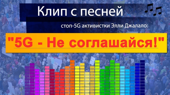 В своей песне "5G - Не соглашайся" австралийская активистка Stop 5G Элли Джалало подытоживает аргументы против расширения мобильной сети 5G впечатляющим, обоснованным и дальновидным образом. На русском языке текст звучит следующим образом: 5G Никогда не соглашайтесь! Мы никогда не хотели 5G И никогда меня не спрашивали... Нет. я говорю Нет Просто хочу быть свободной, в гармонии, Но там, где я вижу, оно приближается ко мне... Стоп! Я говорю: "Нет". Давайте встанем во всём мире, Чтобы остановить эту чёртову штуку! Мы говорим нет... Никогда не соглашайтесь! Для 5G они убивают деревья В полете они жарят птиц, пчёл - Стоп! Мы говорим нет! Мы, люди, ничто для них... Стоп! Мы говорим нет! Давайте поднимемся - мы сильны, мы свободны. Чтобы свергнуть этого дьявола И сказать "нет"... Никогда не соглашайтесь! Слишком многое поставлено на карту - Так мы остаемся при деле. В фатализме? Нет! Мы пишем это на стенах: Мы говорим Нет! Нам не нужен smart город, Напичканный программами для слежки - Нет Мы говорим Нет! Вы шпионите за нами лично... Мы это знаем. И говорим: "НЕТ"! Просто отключить мою человечность - Мы не согласны! Скажите: "Нет" - и снова "Нет"! Ставят вышки на школы, Больницы... Разве это не круто? - Нет, Мы говорим: Нет Где доказательства, что это все не горячо? Так что скажи: НЕТ! Нам не нужно больше облучения, Оставьте наших детей в покое. Мы говорим: Нет... Никогда не соглашайтесь. Мама говорит: НЕТ... Никогда не соглашайтесь! Папа говорит: "НЕТ"... Никогда не соглашайтесь! Дети говорят: "НЕТ"... Никогда не соглашайтесь! Бабушка говорит: "НЕТ". Дедушка говорит: "НЕТ". Пчелы говорят: "НЕТ". Мы говорим: "НЕТ".