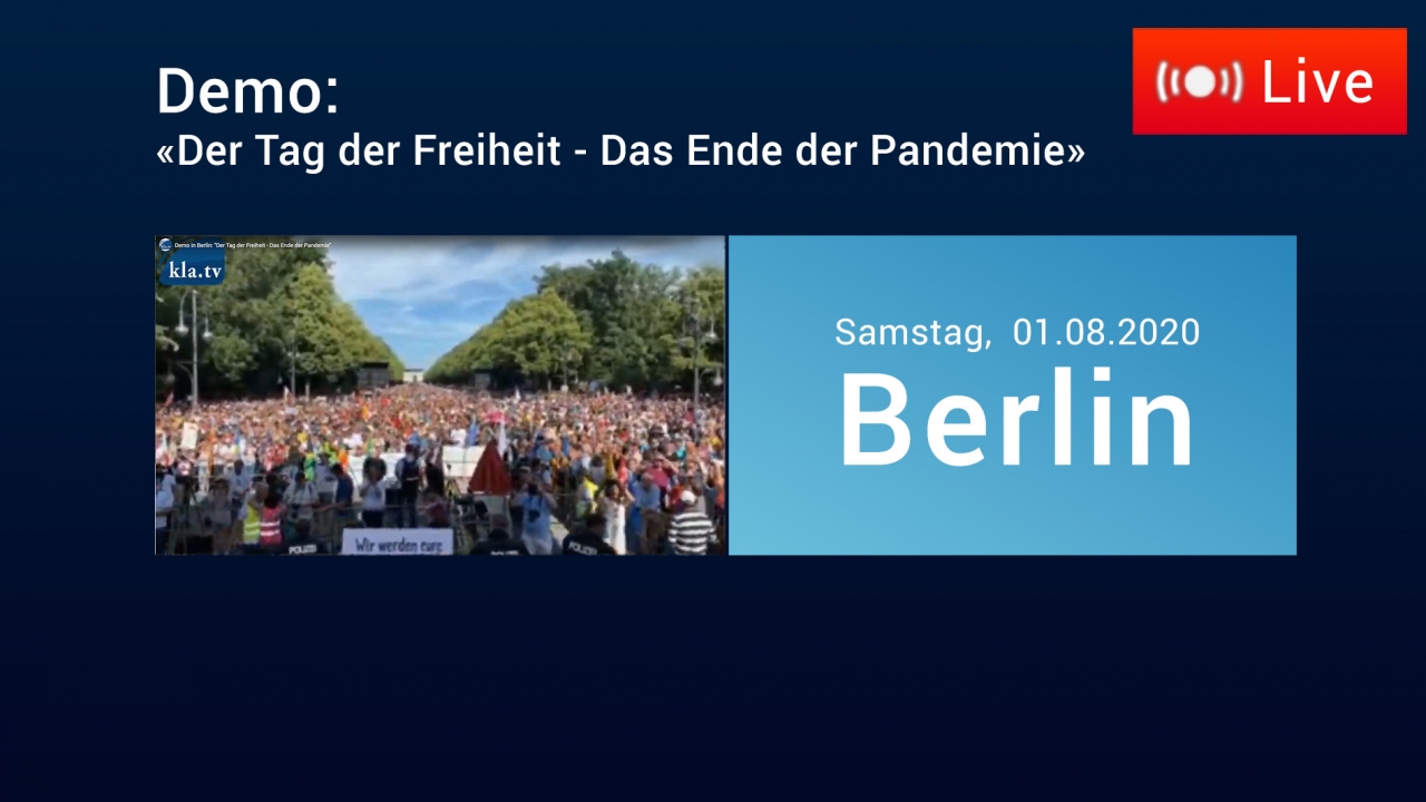 Kla.TV war live dabei: Die Grossdemo in Berlin am 1.August 2020. Ein Tag der in die Geschichte eingehen wird: Die Veranstalter sprachen von über einer Million Teilnehmer. Mainstream-Medien von 17.000. Machen Sie sich ein eigenes Bild. Sehen Sie in diesem Livestream mit eigenen Augen, wie die friedliche Demonstration aufgelöst wurde, Torsten Schulte und weitere verhaftet wurden. usw. usf! Danke an Querdenken 711, Samuel Eckert und RT Deutsch für die Kooperation.