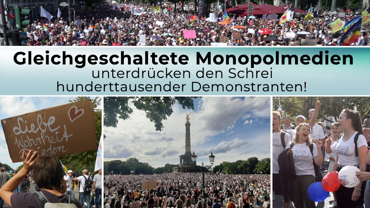 Berlin 01. August 2020: Hunderttausende friedliche Menschen demonstrieren in Berlin gegen die Corona-Maßnahmen der Bundesregierung. Der Veranstalter "Querdenken" gibt die Teilnehmerzahl mit 1,3 Millionen an und beruft sich dabei auf Aussagen der Polizei. Kla.tv dokumentierte ausführlich anhand von glaubwürdigen Zeugenaussagen und Bilddokumenten, dass die Teilnehmerzahl zumindest im Bereich von etlichen Hundertausend Menschen liegt. Wie berichteten jedoch die sogenannten "Qualitätsmedien"? Hier eine kurze Übersicht: Welch unfassbar einheitliche und nachweislich falsche Berichterstattung quer durch alle sogenannten „Qualitätsmedien“ wird hier überaus deutlich? Lässt diese Auflistung überhaupt noch eine andere Schlussfolgerung zu, als dass die Berichterstattung gleichgeschaltet sein muss?! FAZIT vom 1. August: Gleichgeschaltete Monopolmedien degradierten den unüberhörbaren Schrei hunderttausender Demonstranten nach Beendigung der Corona-Maßnahmen zum "Geplärre" einer kleinen Minderheit, die obendrein noch als überwiegend rechtsradikal dargestellt wurde. Berlin 29. August 2020: Wiederum erschallt der Schrei Hundertausender Menschen auf den Straßen Berlins nach Beendigung der Corona-Maßnahmen, wie z.B. Ende der Maskenpflicht. Dies wollte der Berliner Innensenator Andreas Geisel erst gar nicht zulassen und verbot die Demonstration kurzfristig. Er begründete dies damit, dass er "Rechtsextremen und Reichsbürgern" keine Plattform bieten wolle. Dieses Verbot erwies sich vor dem Oberverwaltungsgericht Berlin-Brandenburg letztlich als rechtswidrige Anordnung des Innensenators. Die Veranstalter der Demo mussten somit bereits im Vorfeld hart darum kämpfen, um Ihrem Anliegen überhaupt Gehör verschaffen zu können. Nach der Demonstration gingen die eigentlichen Anliegen Hunderttausender Demonstranten jedoch wiederum völlig unter. Kaum jemand interessierte sich noch dafür, denn die Berichterstattung der gleichgeschalteten Monopolmedien drehte sich fast ausschließlich um den sogenannten "Reichstagssturm", der sich weit abseits der eigentlichen Kundgebung ereignete. Laut Medienberichten hätten drei Polizisten das Eindringen eines "rechten Mob" in den Reichstag "heldenhaft" verhindert. Interessant in diesem Zusammenhang ist auch die Einschätzung des Journalisten Mathias Bröckers, der u.a. für die taz und telepolis tätig ist: Hier ein kleiner Auszug davon: „Das ist alles sehr merkwürdig und riecht mir doch nach sozusagen einem gewollten Zwischenfall oder inszenierten, der ja dann auch funktioniert hat… Es hat Bilder um die ganze Welt produziert: Der Reichstag wurde gestürmt! Die Demokratie ist in Gefahr und so weiter und so fort.... Es fand sozusagen überhaupt keine Großdemonstration statt mit vermutlich Hundertausenden Leuten, sondern es fand mit ein paar Hundert Leuten eine Stürmung des Reichstags statt…“ Ob dieser merkwürdige Zwischenfall möglicherweise tatsächlich gezielt initiiert wurde, wie einige Kommentatoren behaupten, mag jeder selbst beurteilen. Bestehen bleibt aber die Beobachtung, dass dieser zur Unterdrückung des Schreis der Demonstranten instrumentalisiert wurde. Auch hier drängt sich dem neutralen Beobachter klar und deutlich das Bild von gleichgeschalteten Monopolmedien auf. FAZIT vom 29. August: Gleichgeschaltete Monopolmedien unterdrückten den unüberhörbaren Schrei hunderttausender Demonstranten nach Beendigung der Corona-Maßnahmen, indem sie durch die allgegenwärtige Berichterstattung vom sog. "Reichstagssturm" gezielt vom eigentlichen Anliegen der Großdemonstration ablenkten. Diese Beispiele von den beiden Großdemonstrationen in Berlin werfen eine schwerwiegende Frage auf: Zeigt sich nicht auch für die Coronakrise in ihrer Gesamtheit der entscheidende rote Faden darin, dass selbst die bedeutsamsten Gegenstimmen, z. B. von hochrangigsten Experten, kategorisch unterdrückt werden und zwar durch Gleichschaltung von Monopolmedien? Verehrte Zuschauer, haben die Zusammenhänge, die wir in diesem Video aufgezeigt haben, Sie angesprochen? Am 3. Oktober wollen sich Hunderttausende Menschen abermals Gehör verschaffen. Der Veranstalter "Querdenken" lädt mit einem dritten großen Ruf zu einer riesigen Menschenkette um den Bodensee ein. Es soll einer der längsten Menschenketten werden, die Europa je gesehen hat. Sind auch Sie der Meinung, dass die Gleichschaltung diesen Ruf Hunderttausender nicht abermals unterdrücken darf? Dann bieten wir Ihnen die Möglichkeit ein aktives Zeichen zu setzen: Verbreiten Sie JETZT dieses Video, das die Unterdrückung durch die Gleichschaltung aufdeckt, auf allen sozialen Plattformen und auch per Mail an möglichst viele Ihrer Freunde und Bekannte. Wir blenden dazu den Kla.tv-Originallink für diese Sendung ein! Denken Sie dabei insbesondere auch an Menschen, die noch immer medienhörig sind! Nur durch Weiterverbreitung von Gegenstimmen kann dieser Gleichschaltung Einhalt geboten und die Schreie der Menschen unüberhörbar gemacht werden!
