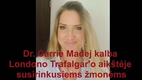 Dr. Carrie Madej kalba Londono Trafalgar'o aikštėje susirinkusiems žmonėms Daktarė Cerri Madej - vidaus ligų gydytoja, osteopatė, ištisus 19 metų vadovavo dviejoms klinikoms Džordžijos valstijoje, JAV. Ji jau seniai domisi vakcinomis. Kodėl COVID-19 vakcinos yra problemiškesnės nei kitos? Londonas, Trafalgaro aikštė Sveiki, taip nuostabu būti šiandien su jumis. Ačiū, kad leidžiate man pasisakyti, man garbė būti pakviestai ir patikėkite, šiandien yra didelė diena. Šiandien yra ta diena, kurią mes visada prisiminsime, nes Londone, jūs rodote pasauliui ką reiškia padėti mūsų skirtumus bei rietenas į šalį ir ateiti visiems kartu vienybėje už laisvę. Bravo ir ačiū! Nes jūs žinote, Londone, kad kažkas pasaulyje negerai. Jūs žinote, kad buvo daug melo ir sukčiavimo, ir manipuliacijų, ir dezinformacijos. Jūs žinote, kad mes daugiau nebegalime taip gyventi. Tai nėra sveika mūsų emocinei būsenai, fizinei būsenai, dvasinei būsenai, finansinei būklei. Kokių tik beprotiškų - pamišėliškų dalykų mums neteko iškentėti. Pradėkime nuo socialinės distancijos. Yra „virusas“ kuris negali peržengti šešių pėdų atstumo. Taigi, mes turime socialinės distancijos taisykles, kurios daugelyje vietų tęsiasi šešis mėnesius. Tai neįtikėtina! Nematau jokios mokslu pagrįstos medžiagos, pagrindžiančios: kodėl to reikia, ir kodėl mes taip elgiamės. Bet ką aš žinau, tai sukelia daug susiskaldymo tarp žmonių. Kontaktavimo su kitais žmonėmis užblokavimas - veikia mus, veikia mūsų sielą. Taip pat pakalbėkime apie medžiagines ir popierines kaukes, kurias prievarta buvome verčiami nešioti daug kartų. Kur yra moksliniai įrodymai, kurie nenuginčijamai įrodo, kad tai veikia? Tiesą sakant, visi mūsų patikimi moksliniai įrodymai įrodo visiškai priešingai! Kodėl visa tai vyksta? Tai eina prieš visą mano medicininį paruošimą, prieš visą mano kolegų medicininį paruošimą. Ne taip yra teisingai naudojama kaukė! Tu nededi kaukės ant sveiko žmogaus, tu prievarta neverti žmogaus ją dėvėti, kai jis įeina į restoraną, išskyrus prie stalo. Pamišimas... Kodėl mes sakome „besimtomiai nešiotojai“? Sveiki žmonės, atseit, kelia pavojų visuomenei. Kodėl mes kišame tuos žmones į karantiną? Kodėl mes kišame tuos žmones dabar jau ir į izoliavimo stovyklas kai kuriose šalyse?! Visa tai labai keista. Kodėl mes griauname maisto tiekimą? Kodėl mes griauname mūsų finansus? Kodėl mes tai darome? Taigi, kai mes nežinome kas pasaulyje darosi, kai mes užduodame klausimus, ir norime atsakymų, mes einame pas pasaulio lyderius, mes einame pas tarptautines organizacijas ir mes jų klausinėjam. Ir jie mums atsakė. Jie mums atsake, kada tai gali pasibaigti. Jie mums atsakė: kad kai beveik VISI šioje planetoje bus suskiepyti su naująja Covid - 19 vakcina, tuomet jau mes galėsime grįžti į kažkokį tai normalų gyvenimą. Bet aš čia tam, kad pasakyčiau didžiulį garsų „NE“! Mes neturime to priimti! Nes, ponai ir ponios, šita vakcina yra visiškai nauja žmonijai. Yra visiškai eksperimentinė. Niekada nebuvo mums atskleista anksčiau. Yra daug dalykų kuriuos jums reikia žinoti. Visų pirma, šita vakcina naudoja vadinamą modifikuotą RNA arba modifikuotą DNR. Tai nėra įprasta vakcina. Jie naudoja skirtingus procesus. Bet jie, taip bendrai paėmus, taip vadinama „transfekcija“, kurią jie naudoja, kad galėtų įterpti genetinį kodą į ląstelių vidų, į mūsų DNR. Vos tik tam atsitikus, tai gali likti mūsų kūne visam laikui! Kai jie sako, kad jie to negali padaryti – jie meluoja. Nes pagal visus mokslinius apibrėžimus – o taip, jie gali. Todėl, kad kai jie naudoja transfekciją, tai yra tas pats procesas, kurį jie naudoja, kad sukurtų genetiškai modifikuotą organizmą, pavyzdžiui kaip Monsanto sėklos, kurios yra sterilios ir ne tokios sveikos. Todėl absoliučiai taip – jie gali paveikti mūsų genetiką. Absoliučiai taip – jie gali paveikti mūsų sveikatą ir net mūsų vaisingumą. Kodėl jie meluoja? Ko dar galime tikėtis iš viso šito ilgalaikėje perspektyvoje? Padidinta vėžio rizika, padidinta mutagenezė, padidinti autoimuniniai sutrikimai. Pradiniai kai kurių vakcinų tyrimai, pavyzdžiui, tokios kaip Moderna vakcinos. Jie turėjo tik 45 pacientus viename tyrime. Jie turėjo žemos dozės vakcinos grupę ir aukštos vakcinos grupę tyrimams. 100% iš aukštos dozės vakcinų grupės dalyvių, gavo sisteminius šalutinius poveikius. Iš žemos dozės vakcinų grupės 80% dalyvių iš karto buvo matomi greitai pasireiškiantys šalutiniai poveikiai. O tai kaip tada su ilgalaikiais šalutiniais poveikiais? Ir jūs taip pat turite žinoti, kad jie neatliko bandymų su gyvūnais beveik visose šitose vakcinų stadijose. Labai įdomu, kodėl? Na jie sako mums, kad jie „neturi laiko“. Kad jie tai daro dėl „publikos gerovės“, ir „saugumo“ nematau... Sugrįžkime keletą metų atgal. Nes jei bandė anksčiau daryti šią vakciną testuodami ją ant gyvūnų. Modifikuoti RNR. Ir per bandymus su gyvūnais atrodė, kad gyvūnai turi stiprų imunitetą. Bet kai su gyvūnais buvo išbandyta vakcina - gyvūnai susirgdavo arba mirdavo. Jiems pablogėdavo. Ar tai yra ką jie bando nuo mūsų paslėpti? Ar tai potencialiai gali mus nužudyti ar sužaloti sveikatą, kai mums bus pristatytas šitas virusas vėl ar panašus virusas? Labai tikėtina. Bet ponios ir ponai, tai dar net ne blogiausia dalis iš to, kad jie nori įvesti į mūsų kūną. O štai ir svarbiausia dalis. Jie planuoja naudoti unikalų vakcinos identifikatorių, kurio sudedamoji dalis vadinasi „liuciferazė“. „LIUCIFERAZĖ“. Tai yra bioliuminescenciniai nano kristalai. Jie pradeda šviesti tam tikrose sąlygose. Jūs negalėtumėte jų pamatyti ar jausti ant odos, bet suleidus juos į jūsų kūną šitie nano kristalai galės parodyti, ar jūs vakcinuotas. Ir 