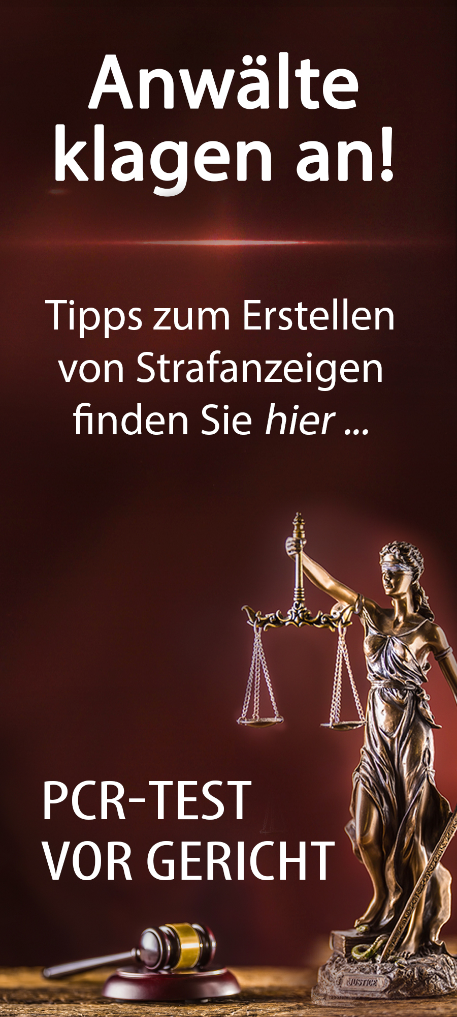 Lassen wir doch diesem Aufschrei Taten folgen: Verbreite diese Warnungen, soweit du nur kannst. Reiche eine Strafanzeige an die Staatsanwaltschaft an deinem Ort ein. Im Sendungstext meiner Rede „PCR-Test vor Gericht – Anwälte klagen an!“ kannst du eine fertige Strafanzeige als Vorlage herunterladen. Demnächst wird auch eine für die Schweiz dort aufgeschaltet sein.