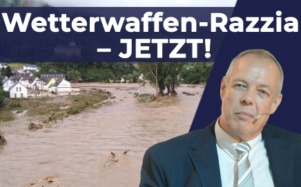 Und meine Frage ist einfach: Kann das alles Zufall sein? Das kann ich gar nicht glauben. Zehn Jahrhundert-Hochwasser in 41 Jahren pünktlich. Und die anderen drei ein paar Monate vor - also im Vorjahr vor der Bundestagswahl oder im Jahr danach. Und als bekennender Verschwörungspraktiker kann ich nur sagen, ich glaub nicht an Zufall. Aber ich sag Ihnen auch ganz ehrlich und ganz offen, mir fehlen Belege, dass hier Wetterbeeinflussung stattgefunden hat. Die fehlen mir. Und deswegen habe ich klare politische Forderungen. Wir brauchen sofort einen Polizeieinsatz in Kanzleramt, Geheimdiensten, Bundeswehr. Weil wir sofort wissen müssen, was gibt es da für Akten zu diesem Thema. Und das muss das Volk wissen.