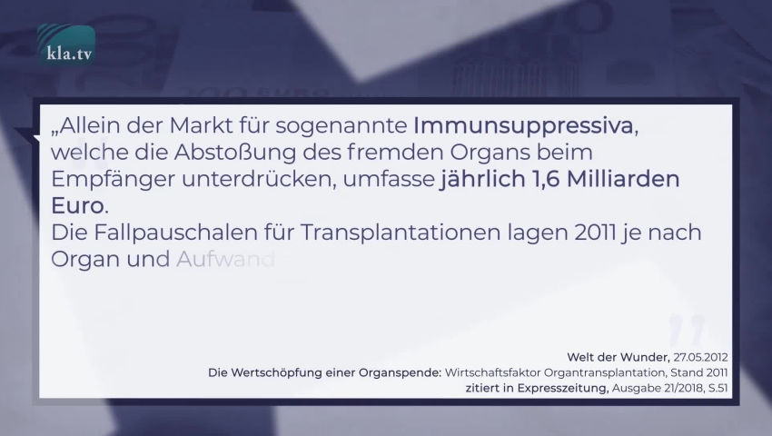 ”Само тржиште лекова за потискивање имуног система, који спречавају одбацивање органа код примаоца, износи годишње 1,6 милијарди еура. Паушални рачуни за трансплантације су 2011 коштали између 18.000 и 215.000 еура, у зависности од органа и осталих трошкова. Нпр. једна јетра кошта између 98.000 и 130.000 долара, једно срце 130.000 до160.000 долара.