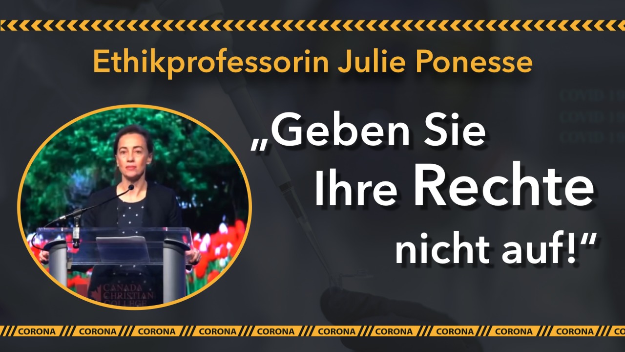 Dr. Julie Ponesse ist Professorin für Ethik und lehrt seit 20 Jahren am Huron University College in Ontario, Kanada. Weil sie sich nicht gegen Covid impfen ließ, wurde sie entlassen und durfte das Universitätsgelände nicht mehr betreten. Sie hielt am 28. Oktober 2021 eine beeindruckende Rede für die kanadische Netzwerk-Initiative „The Democracy Fund".