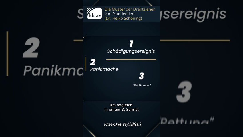 In seinem Interview stellt Heiko Schöning die Strukturen und Muster dar, nach denen die Drahtzieher von Plandemien vorgehen: Schritt eins: Ein sich ausbreitendes Schädigungsereignis wird verkündet. Im zweiten Schritt wird eine Panik erzeugt und werden Einschränkungen verordnet, um sogleich in einem dritten Schritt die angeblich einzige Rettung zu offerieren.