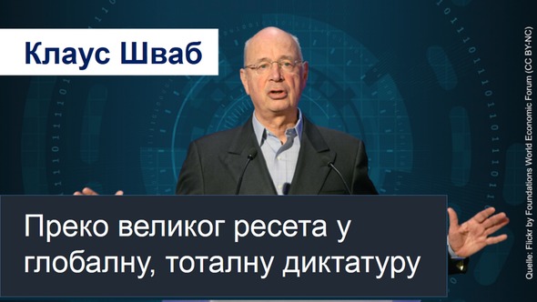 Оснивач и извршни председавајући Светског економског форума, Клаус Шваб, покретачка је снага планираног великиог ресета. Он отворено признаје да то за људе широм света значи да ће лична слобода бити потпуно изгубљена: "Алати Четврте индустријске револуције омогућују нове облике надзора и друга средства контроле која су у супротности са здравим, отвореним друштвима." Одушевљава се чињеницом да нове технологије ”могу продрети у до тад приватни простор нашег ума, читати наше мисли и утицати на наше понашање”. Једноставним језиком: актуелно, ови финанцијски олигарси, конкретно раде на укидању приватности. Према Швабовом схваћању, он замишља идеалну блиску будућност људи користећи "интелигентне тетоваже", "биолошке компјутере", "организме по мери", "наноботове" [Објашњење: роботи или молекуларни уређаји у минијатурном формату] и "активне, имплантабилне микрочипове који пробијају кожну баријеру нашег тела". Како би се постигло ово потпуно умрежавање, праћење и свеобухватна владавина, потребна је пета генерација мобилних комуникација 5Г. Оно што је бризантно: Шваб и његов тим, за брзо спровођење, имају поверења у безусловну сарадњу, по плану, свих глобалних руководилаца. Шваб дословно: "Ви ћете заправо добро искористити пандемију тако што нећете допустити да криза прође бескорисно." Једноставним језиком: пандемија се злоупотребљава за спровођење сопствених циљева неколицине финанцијских феудалаца! То би нам требало отворити очи за чињеницу да су наши политички и економски руководиоци укључени као помоћници у тим плановима - односно лојални у том подухвату, очигледно ради личне користи. Чврсти план је, наше отворено друштво, наше здравље, па чак и наше најинтимније мисли ставити под контролу неколицине самопроглашених светских финанцијских диктатора који су опседнути најпатолошкијом себичношћу и самоиспуњењем. Је ли то неизбежна судбина целог човечанства? Ни близу! Ненасилни отпор и победа Индијаца под Гандијем над британском колонијалном надмоћи, као и пад зида који дели Nемачку на источни и западни сектор, показују да је становништво сасвим способно формирати редове против деспотског туторства.