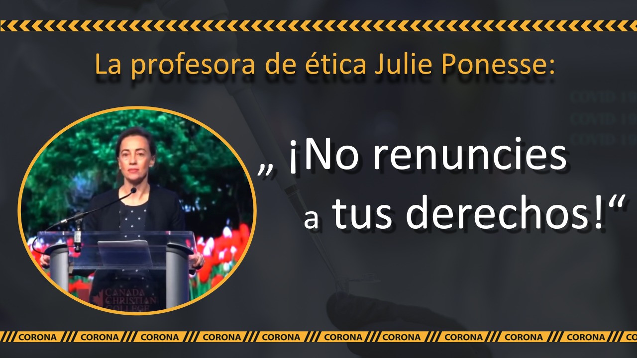 La doctora Julie Ponesse es profesora de ética y lleva 20 años enseñando en el Huron University College de Ontario (Canadá). Por no vacunarse contra el covirus, fue despedida y expulsada del campus universitario. El 28 de octubre de 2021 pronunció un poderoso discurso para la iniciativa canadiense de creación de redes The Democracy Fund.