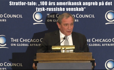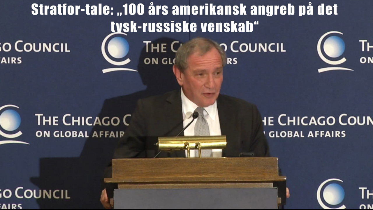 Stratfor-tale: „100 års amerikansk angreb på det tysk-russiske venskab“ Mit navn er Nick Brand, og jeg er direktør for fælles programmer i Chicago Council on Global Affairs. Tak, fordi De kom. Jeg benytter lejligheden til at byde George Friedman velkommen her i "The Chicago Council". Jeg tror, det er første gang, han er her, og tak, fordi du er her hos os. George Friedman: "Intet sted kan forblive fredeligt i det lange løb. Ikke engang USA, jeg mener, vi (USA) er altid ledsaget (eller påvirket) af krige. Jeg tror ikke, at Europa vil vende tilbage til de store krige, men det vil vende tilbage til den menneskelige normalitet: Den vil have sine krige, sin fredstid, og den vil miste sine liv. Der vil ikke være 100 millioner døde som i den sidste krig, men tanken om europæisk valgfrihed vil, tror jeg, bidrage hertil. Der vil opstå konflikter i Europa, der har allerede været konflikter i Jugoslavien og nu også i Ukraine. Europas forbindelser med USA - vi har ingen forbindelser med Europa. Vi har forbindelser med Rumænien og Frankrig, men der findes ikke noget "Europa", som USA ville have forbindelser med. "Spørgsmål fra publikum: "Er islamistisk ekstremisme den største trussel mod USA, og vil den dø ud, eller vil den fortsætte?" George Friedman: "Han er et problem for USA, men ikke en eksistentiel trussel. Det skal håndteres på passende vis. Vi har andre udenrigspolitiske interesser. Hovedinteressen i USA's udenrigspolitik i det sidste århundrede, under Første Verdenskrig, Anden Verdenskrig og den kolde krig, var forholdet mellem Tyskland og Rusland, fordi de tilsammen er den eneste magt, der kan true os. Vores hovedinteresse var at sikre, at dette ikke skete. Hvis du er ukrainer, vil du søge efter den eneste, der kan hjælpe dig, og det er USA. I sidste uge eller for ca. 10 dage siden besøgte den øverstkommanderende for de amerikanske landstyrker i Europa, general Ben Hodges, Ukraine. Han meddelte der, at amerikanske militærrådgivere snart vil komme officielt til Ukraine. Faktisk uddelte han medaljerne til de ukrainske krigere, selv om den amerikanske militærprotokol forbyder, at der uddeles medaljer til udlændinge. Men det gjorde han, fordi han ville vise, at den ukrainske hær er hans hær. Så gik han. Og nu leverer USA våben, artilleri og andet militært udstyr til de baltiske lande – til de baltiske lande, Rumænien, Polen og Bulgarien. Dette er et meget interessant punkt. I går meddelte USA, at det planlagde at levere våben til Ukraine. Det blev benægtet, men de gør det, og våbnene bliver leveret. Og i alle disse handlinger handler USA uden for NATO. Fordi NATO-beslutninger skal træffes enstemmigt af alle NATO-medlemmer. Pointen med det hele er, at USA er ved at opbygge et "cordon sanitaire" (et "sikkerhedsbælte") omkring Rusland. Og det ved Rusland. Rusland mener, at USA har til hensigt at splitte Den Russiske Føderation. Jeg tror ikke, at vi ønsker at dræbe dem, vi ønsker blot at skade dem eller tilføje dem noget skade. Nå, men nu er vi tilbage i det gamle spil igen. Og hvis du spørger en polak, ungarer eller rumæner, så lever de i en helt anden verden end tyskerne, og tyskerne lever i en helt anden verden end spanierne. Der er altså uenighed i Europa. Men hvad ukrainerne vil foretrække, vil jeg fortælle jer helt præcist: De vil forsøge at få USA ind i deres land. USA kontrollerer af grundlæggende interesse alle verdenshavene. Det har ingen magt nogensinde gjort. Det er derfor, vi invaderer verdens folk, og de kan ikke gøre noget ved det. Det er en meget smuk ting. Ved at bevare kontrollen over havene og i rummet sikrer vi vores magt. Den bedste måde at besejre en fjendtlig flåde på er at forhindre, at den bliver bygget. Den måde, som briterne sikrede sig, at ingen europæisk magt kunne opbygge flåden, var, at europæerne bekæmpede hinanden. Den politik, som jeg vil anbefale, er den politik, som Ronald Reagan anvendte i Iran og Irak. Han støttede begge sider i krigen, så de kæmpede mod hinanden og ikke mod os. Det var kynisk, det var ikke moralsk forsvarligt, men det virkede. Og det er netop det, der er pointen: USA er ikke i stand til at besætte hele Eurasien. I det øjeblik vores støvler rører jorden der, er vi demografisk set i undertal. Vi kan knuse en hær, men vi er ikke i stand til at besætte Irak. Selve tanken om 130.000 amerikanske tropper, der besætter et land med 25 millioner indbyggere.... Forholdet mellem antallet af politibetjente og New Yorks befolkning er større end forholdet mellem antallet af amerikanske soldater og den irakiske befolkning var. Vi er altså ikke i stand til at intervenere militært overalt, men vi er i stand til først og fremmest at støtte de magter, der kæmper mod hinanden, så de kan koncentrere sig om sig selv - at støtte dem politisk, finansielt og militært, levere våben og sende amerikanske rådgivere ud. Og i ekstraordinære tilfælde, som vi gjorde det i Japan, nej, i Vietnam, Irak og Afghanistan, gribe ind med forebyggende angreb ("ødelæggende angreb"). Taktikken med forebyggende angreb har ikke til formål at besejre fjenden, men at bringe fjenden ud af balance. Det forsøgte vi at gøre i alle krige, f.eks. i Afghanistan, hvor vi bragte al-Qaeda ud af balance. Problemet, som vi har, fordi vi er så unge og dumme, er, at vi holder fjenden ude af balance, og i stedet for at sige: "Vi klarede opgaven godt, lad os tage hjem nu", siger vi: "Mand, det var nemt, lad os bygge et nyt demokrati her." Det var det øjeblik, hvor vi blev ramt af svaghed i vores sind. Svaret er derfor, at USA ikke kan intervenere militært overalt i Eurasien. Man skal gribe selektivt og så sjældent som muligt ind. For os er militær intervention et særtilfælde, en sidste udvej. Vi kan ikke sende amerikanske tropper i første omgang. Men hvis vi sender amerikanske tropper, så skal interventionen være begrænset og må ikke få gigantiske proportioner, og det har vi allerede forstået
