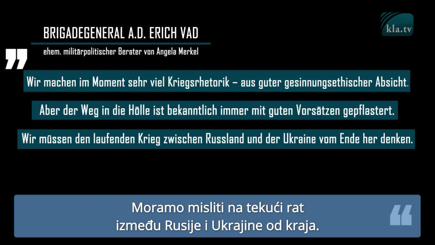 Poštovani gledatelji, ako nas vlasti žele uvesti u rat, a narod odbija i diže glas protiv bilo kakvog ratnog huškanja, to se još može spriječiti! Konačno, poslušajte sljedeći citat: „Trenutno pravimo mnogo ratne retorike – iz dobrih namjera u etičkom smislu. No, kao što je poznato, put do pakla uvijek je popločan dobrim namjerama. Moramo misliti na tekući rat između Rusije i Ukrajine od kraja. Ako ne želimo Treći svjetski rat, prije ili kasnije morat ćemo izaći iz ove logike vojne eskalacije i započeti pregovore!"