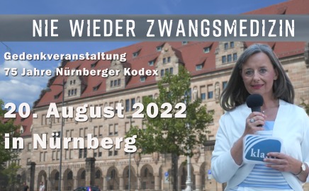 „Das Recht auf Leben und körperliche Unversehrtheit ist unantastbar“ – nie waren die Forderungen des Nürnberger Kodex weltweit nötiger als heute. Deshalb findet anlässlich seines 75 jährigen Jubiläums am 20.08.2022 in Nürnberg eine Gedenkveranstaltung statt, verbunden mit dem Aufruf, mitzumachen – gerichtet an „alle unbestechlichen Menschen, die noch einen unerschütterlichen moralischen Kompass haben“… [weiterlesen]
