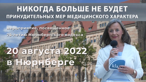 "Право на жизнь и физическую целостность неприкосновенно" - требования Нюрнбергского кодекса никогда не были так актуальны во всем мире, как сегодня. Поэтому по случаю 75-летия 20.08.2022 года в Нюрнберге состоится памятное мероприятие, приглашающее присоединиться - обращение ко "всем неподкупным людям, у которых еще остался непоколебимый моральный компас"...