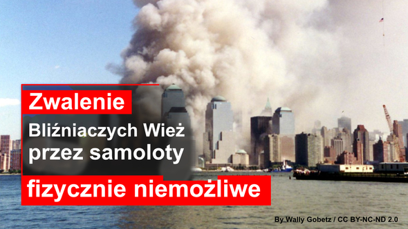 To co stało się z Bliźniaczymi Wieżami 11 września 2001 roku byłoby fizyczną niemożliwością z powodu uderzeń samolotów, ponieważ: - Budynki zostały zbudowane w sposób bezpieczny dla samolotów, aby wytrzymać nawet Boeinga 707. - Niemożliwe, że asymetryczne uderzenie może spowodować symetryczny upadek. - Niemożliwe było, aby dwa samoloty strąciły trzy wieżowce. Budynek nr 7 jednak runął wraz z nimi! - Paliwo lotnicze eksplodujące w dużej kuli ognia nie mogło potem jeszcze niemal zrównać z ziemią 110 pięter, jak to się stało. - Belki stalowe ważące tony nie mogą podczas pożaru odlecieć setki metrów w bok. - Niewielka ilość paliwa lotniczego nie jest w stanie rozpuścić 100 000t betonu niemal w powietrzu. - Parafina nie mogła zamienić w pył ogromnych stalowych siatek, gdy były jeszcze w powietrzu, - Termit jednak mógł: ... takie pozostałości nuklearne znajdowano wszędzie w gruzach. - Koryta przeciwpowodziowe budynków mogły pozostać nienaruszone tylko dlatego, że prawie wszystkie 110 kondygnacji zostało sproszkowanych podczas swobodnego spadania. - Jednoczesne zniszczenie bez detonacji wszystkich stalowych dźwigarów wieżowca byłoby fizyczną niemożliwością. - Niemożliwe zatem, że NIST nie wszczął dochodzenia w sprawie materiałów wybuchowych, a wszystkie stalowe szczątki zostały wysłane do Chin w ciągu 2 tygodni, jeszcze przed jakimkolwiek dochodzeniem.