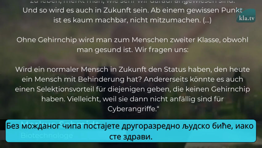 Без можданог чипа постајете другоразредно људско биће, иако сте здрави. Питамо се: да ли ће нормалан човек у будућности имати статус који данас има особа са инвалидитетом? С друге стране, може постојати и селективна предност за оне који немају чип у мозгу. Можда зато што тада нису подложни за сајбер-нападе.”