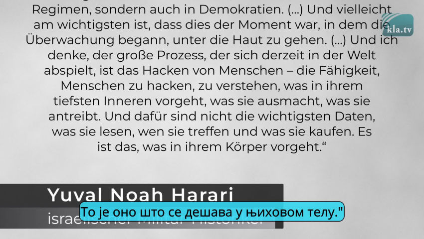 Израелски војни историчар Јувал Ноа Харари је аутор и професор на одсеку за историју на Хебрејском универзитету у Јерусалиму. Веома је хваљен од особа као што су Барак Обама, Ангела Меркел, Емануел Макрон и Себастијан Курц и он им је извор инспирације и савета. Клаус Шваб, оснивач Светског економског форума (ВЕФ) и аутор књиге „Ковид-19: Велико ресетовање“, описује Харарија као бриљантног истраживача будућности. У својим наступима на Светском економском форуму 2018. и 2020. или Атинском демократском форуму 2020, Харари је говорио о технолошком развоју и шта он значи за друштво, политику, религију и идеологију. У својим предавањима он стално истиче да је по први пут у људској историји сада могуће посматрати и пратити људе било када и било где да су. Алгоритми вештачке интелигенције обрађују огромне количине информација веома великом брзином и имају потенцијал да запамте све и препознају обрасце у подацима за анализе које се односе на конкретну особу. Харари каже: „Систем који нас разуме боље него што ми себе разумемо, може да предскаже наша осећања и изборе, може да манипулише нашим осећањима и одлукама и на крају може да доноси одлуке уместо нас. Према Харарију, пандемија корона-вируса отворила је капију за „надзор испод коже“. Цитат: „Мислим да ако се људи за неколико деценија осврну уназад, главни разлог зашто ће памтити ковид-кризу је тај, што је то био тренутак када је све постало дигитално. И то је био тренутак када се све пратило пристајањем да се стално прати, не само у ауторитарним режимима него и у демократијама. (...) И можда најважније, ово је био тренутак када је надзор почео да се увлачи под кожу. (...) И мислим да велики процес, који се тренутно дешава у свету, јесте хаковање људи – способност да се хакују људи, да се разуме шта се дешава дубоко у њима, шта их чини оним што јесу, шта их покреће. А за то није најважнији податак шта читају, са киме се састају и шта купују. То је оно што се дешава у њиховом телу." Даље, историчар је у интервјуу 2020. рекао: „(...) али неке владе и компаније су у стању да по први пут у историји, систематски хакују људе. Много се прича о хаковању рачунара, паметних телефона и банковних рачуна, али СТВАР нашег времена је могућност хаковања људи. (...) Људи су сада животиње које се могу хаковати. Знаш, целу идеју коју људи имају, знаш, да они имају ову душу или дух и њихову слободну вољу и нико не зна шта се дешава у мени. Значи, шта год да изаберем, било на изборима или у самопослузи – то је моја слободна воља. С`тим је готово!" Оно што нам „футуристички” професор историје каже није фикција. Многе компаније широм света раде на технологијама за имплантацију сензора под кожу. Неке технологије су већ применљиве и доступне на тржишту. Између осталог, ово је намењено лечењу болести, проширењу људских способности или једноставно удобнијем животу. Распон је велики. На пример, британско-пољска компанија Валетмор (Walletmor) од прошле године нуди имплантабилне чипове за плаћање. Они се могу плацирати под кожу и, према компанији, званично су одобрени и функционишу свуда где се прихватају бесконтактна плаћања. Људи користе мале имплантате микрочипа да откључају своје бицикле, да замене кључеве у свом дому или да уђу у канцеларију. Кохлеарни имплантати враћају слух. Дијабетичари носе под кожом сензоре за мерење нивоа шећера у крви. Њихова врх