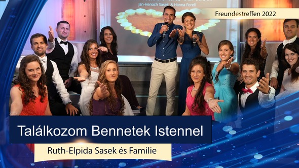 Köszöntök mindenkit! Ma én vezethetem be a következő dalt. Néhány héttel ezelőtt a testvéreimmel együtt megmutattunk egy szöveget, írtunk egy dalt, még pedig egy vészhelyzetben. Éppen akkor volt egy újabb rágalomhullám az egész német nyelvterületen, és ez főként a szüleimet érintette. És valahogy mindannyian szinte már nem bírtuk tovább elhordozni, egyszerűen túl sok volt. Habár valójában már kiskorunk óta ismerjük a rágalmak hullámait. Mielőtt megszülettem volna, a rágalmaknak ezek a hullámai már működtek, Amikor egyéves voltam, a házunkat megrohamozta a rendőrség rágalmazások miatt, de aztán rövid idő mulva gratuláltak a szüleinknek, és azt mondták, hogy: "Ha mindenki olyan lenne, mint ti, akkor nem lenne több munkánk". Ez persze, szerintem ez is szép dolog. Minden esetre már 2018-ban is szerettem volna írni egy dalt apának és anyának, de most született meg, ebben a vészhelyzetben. És természetesen mindannyiótoknak énekeljük, de volt egy oka, amiért ezt megírtam. Egyszerűen feltettem magamnak a kérdést: Hogy lehet ez, hogy a csudába lehet ez, hogy valakit évtizedeken keresztül üldöznek, rágalmaznak, ő pedig csak megy tovább, rajta marad, itt van, és az utolsó ingét is odaadja a többieknek, nem számít, mit mondanak körülötte, mi történik, akik egyszerűen továbbmennek. Ez emberfeletti. Elgondolkodtam ezen, hogy mi az oka ennek? És azt mondtam, hogy bennetek találkozom Istennel, benned találkozom Istennel, Apa, és benned, Anya. Ez nem lehetséges, erre egyetlen emberi lény sem képes. És arra gondoltunk, hogy amikor látjuk, hogyan éltek, milyen nemes életmódot folytattok, hogy például soha nem mentek addig aludni, amíg valahol szorít a cipő. Amikor látjuk, hogy 38 év házasság után milyen szeretettel viszonyultok egymáshoz, akkor azt mondom, hogy ugyanarra az alapra akarok építeni. Azt mondom nektek, hogy ha valamit állandóan ráz és tépáz a vihar, akkor az itt van, akkor az apa és anya, ők pedig szilárdan állnak és mennek tovább. És ez egy olyan alap, amely megáll, azt mondtam magamnak személy szerint. Ugyanezt az életmódot akarom, erre az alapra akarok építeni, erre akarunk építeni. És ezért akarjuk ezt (a dalt) elénekelni nektek, megerősítésként, de nektek (nézőknek) is, és minden csodálatos lesz! Anya, te királynő vagy, minden tiszteletet megérdemelsz. 11 gyerekkel, ilyen frissen és fiatalon és minden évvel egyre szerelmesebb vagy. Tudod egyáltalán, hogy mennyire fontos vagy nekünk. és hogy nélüled nincs otthonunk? Apa, te vagy a legjobb ember, akit ismerek, csak eltátom a számat, amikor látom., mi mindent csinálsz és hogyan harcolsz a világ javáért. Minden szavad erő és élet. Állandóan azt kérdezem magamtól, hogy vajon honnan veszed ezt? Igen, amikor látom, hogyan élitek az életeteket és a nap sosem nyugszik le úgy, hogy szakadék tátongana köztetek, ezt tanítottátok nekünk kiskorunktól fogva. Akkor megbánok minden más életmódot mert bennetek találkozom Istennel. Bennetek találkozom Istennel Meg tudja valaki érteni, milyen árat fizettek ti ketten? És mégis mindig újra és újra itt álltok és mindent beleadtok, amitek csak van. Nem számít, milyen igazságtalanság történik most itt, Tudom, hogy minden a javunkra szolgál. Igen, amikor látjuk, hogyan élitek az életeteket és a nap sosem nyugszik le úgy, hogy szakadék tátongana köztetek, ezt tanítottátok nekünk kiskorunktól fogva. Akkor megbánunk minden más életmódot mert bennetek találkozunk Istennel. Benned találkozom Istennel Benned találkozom Istennel Benned találkozom Istennel Benned találkozom Istennel Benned találkozom Istennel Benned találkozom Istennel Benned találkozom Istennel Benned találkozom Istennel Benned találkozom Istennel Bennetek találkozunk Istennel