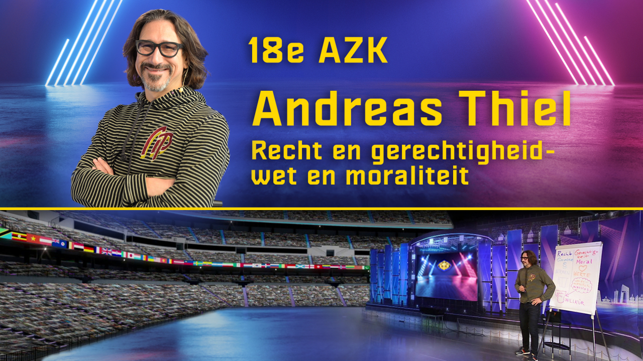 Introductie Andreas Thiel (Ivo Sasek) Oké. Dus wat u nu van mij hebt gehoord, het onderwerp dat net is besproken, wordt nu nog verder door een man uitgediept. En deze man werd de AZK aanbevolen door dezelfde Zwitserse rechter waarover ik het in mijn toespraak had. En hij zal over dit thema: ‘recht en rechtvaardigheid - Wet en Moraal’ een interessante toespraak houden. Ik zou zeggen, verwelkom samen met mij de bekende Zwitserse satiricus en staatsfilosoof Andreas Thiel. Andreas Thiel is de voorvechter onder de Zwitserse intellectuelen. Als een van de weinige liberale kunstenaars beweegt hij zich ver buiten de door de staat gesubsidieerde kunstwereld. Hij stelt beheer gelijk aan onverantwoordelijkheid, politieke correctheid aan gebrek aan humor en ‘wokeness’ aan geestelijke verwaarlozing. Hij werd bekend door zijn politieke satires, die hij van 1997 tot 2017 op podia van Bern tot Bangkok opvoerde en waarvoor hij met kunstprijzen werd overladen (zie hieronder). Sinds 2019 heeft hij een nieuwe vorm van denken geïntroduceerd, gebaseerd op zijn taalkundige en filosofische beschouwingen - waaronder zijn nieuwste format YOYOGAGA op www.kontrafunk.radio. In 2023 verschijnt de filmpilot van zijn staats-filosofische filmreeks LES SANSPAPIERS (De ‘Papierlozen’) (www.lessanspapiers.ch), die hij samen met rechtsfilosoof Prof. Dr. ir. David Dürr uit Basel ontwikkelt en produceert. Andreas Thiel genoot zijn theateropleiding bij Desmond Jones in Londen, stemtraining en spraakonderwijs bij Anneliese Fackler in Zürich, poëtica en etymologie bij Christof Stählin in Friedberg. Andreas Thiel werd op 02.02.1971 in Bern geboren als tweede zoon van een vroedvrouw en een ingenieur. Na enkele jaren in IJsland en India, woont hij sinds 2015 met zijn vrouw en hun twee dochters in Centraal-Zwitserland. Palmarès: 1999 Salzburger Stier 2003 Zwitserse Kleinkunst Prijs 2005 Zwitserse Mediaprijs De Walo Prijs 2005 De Pantheon Prijs (D-Bonn) 2006 Humorfüller (Stand-up Comedy) (Arosa Humorfestival) 2008 De Cornichon (Augurk) Prijs (Olten, Kabaret Dagen) 2009 Zwitserse Liberal Award 2013 Duitse Kabaret Prijs (D-Neurenberg) 2014 Zwitserse Prijs voor de Vrijheid (Bonny Foundation voor Vrijheid) Andreas Thiel Toespraak Hartelijk dank, Ivo. Ik groet jullie allemaal in de hele wereld, lieve vrienden, op alle continenten! Ik ben overweldigd door de grootte van dit stadion hier, ik voel me hier als een gletsjer-vlo op de Zuidpool. Ik wil graag enkele taal-filosofische gedachten met u delen, namelijk over de relatie tussen recht en rechtvaardigheid. Recht en rechtvaardigheid worden vaak verward, door elkaar gehaald, vermengd, en eigenlijk hebben deze twee dingen helemaal niets met elkaar te maken. Laten we eens kijken naar de relatie tussen Recht en rechtvaardigheid. Als ik deze ‘flip-over’ van Ivo hier steel, dan kan hij me aanklagen. En aangenomen dat hij de diefstal niet kan bewijzen, dan moet de rechter me vrijspreken omdat in een rechtsstaat is een schuld alleen een schuld als die bewezen is. Het Recht is gebaseerd op wetten, en wetten zijn NORMEN. Een norm is een maatstaf, een meeteenheid, wat betekent dat een wet iets meetbaars moet zijn. We spreken ook van "wettelijke normen". En daarom is een schuld alleen een schuld als die bewezen kan worden. Als de diefstal niet bewezen kan worden, mag ik de flip-over houden. En dat is geen rechtvaardigheid, maar het is juist omdat rechtvaardigheid niet uit de wet voortkomt, maar rechtvaardigheid heeft te maken met moraal. Als ik een moreel persoon was, zou ik de flipover helemaal niet stelen, dat zou rechtvaardig zijn. Maar als ik het steel, kan Ivo ook moreel handelen en denken: ach, de arme kunstenaar heeft een flip-over nodig, laat hem die maar nemen. Dat zou niet volgens de wet zijn, maar rechtvaardig omdat het een morele kwestie is. Maar als Ivo zijn flip-over terug eist, zal de rechter me toch vrijspreken als Ivo de diefstal niet kan bewijzen. En als Ivo nu op het idee komt dat hij denkt: nou, als ik geen rechtvaardigheid krijg via het wettelijke Recht, dan haal ik mijn flipover zelf wel terug. Nu komt Ivo en breekt bij me in, en haalt de flip-over terug. Maar ik heb een bewakingscamera! Nu kan ik Ivo aanklagen en beweren dat hij de flip-over van mij heeft gestolen. En omdat ik deze diefstal kan bewijzen, moet Ivo mij de flipover teruggeven en wordt hij ook gestraft door de rechter. En nogmaals, dat is niet eerlijk, maar het is wel Recht. We zien dus dat gerechtigheid duidelijk niets te maken heeft met Recht. Het heeft te maken met het feit dat we twee verschillende categorieën hebben, net zoals Recht voortkomt uit wetten en wetten normen zijn, komt rechtvaardigheid voort uit moraal. En moraliteit kan niet gestandaardiseerd worden. Moraal bestaat uit waarden. We hebben hier te maken met twee verschillende categorieën woorden, namelijk normen en waarden. Net zoals normen meetbaar moeten zijn, net zoals een rechter iets meetbaars moet hebben om te kunnen oordelen, zijn waarden niet meetbaar. Waarden als vergeving, barmhartigheid, geduld, lankmoedigheid en vrijgevigheid zijn niet meetbaar, omdat waarden onmeetbaar zijn. En wat onmeetbaar is, is ook onmetelijk. Dat is het verschil. Gerechtigheid is iets onmetelijks. Morele actie is onmeetbaar. Waarden zijn onmeetbaar. Het is niet te meten. Maar de wet moet meetbaar zijn. Dat is iets heel anders. En mochten we in de verleiding komen om rechtvaardigheid in de wet te stoppen: dan zorgt dat voor het volgende: Omdat we steeds maar weer morele concepten in de wet zetten, staan onze wetten dus vol met termen die er niet in thuishoren. De beroemdste zin van de Duitse grondwet luidt: ‘De menselijke waardigheid is onschendbaar’. Iedereen is zo trots op deze zin. De menselijke waardigheid is onschendbaar. Het is een mooie zin, een prachtige zin, maar het hoort niet thuis in een wet. Omdat het woord "waardigheid" geen norm is, maar een waarde. Waardigheid is niet meetbaar. Het is niet normatief. Het woord "waardighei