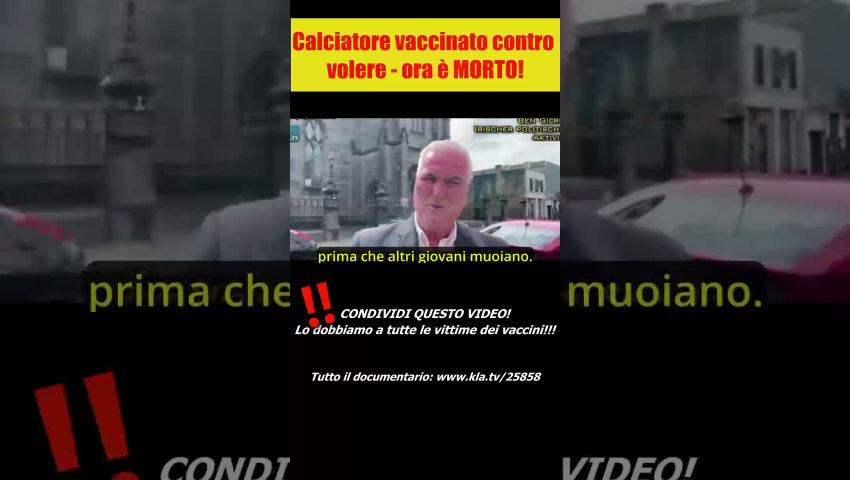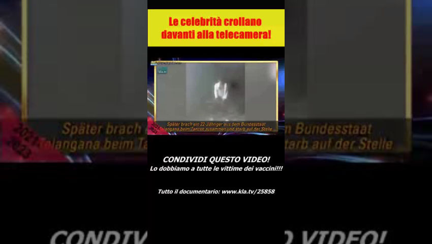 Attrice comica: “Voglio che sappiate che sono vaccinata già 3 volte! Ho viaggiato, sono stata in Messico due volte, ho partecipato a spettacoli, ho incontrato e salutato persone e non mi sono mai ammalata di Covid - naturalmente! Gesù mi ama sopra ogni cosa! Davvero. È così carino, così bello...!”. A questo punto cade all'indietro sulla testa e rimane distesa.... Trailer di tutti i collassi e le morti: Un calciatore di 21 anni muore in campo. Un'altra vittima della vaccinazione assassina all'mRNA. Un giocatore di Kabaddi di 22 anni muore di infarto durante una partita. Un'altra vittima delle vaccinazioni tossiche. Un atleta di 24 anni muore improvvisamente dopo un collasso durante una partita a causa delle vaccinazioni. Giovane kickboxer collassa e muore sul ring dopo una vaccinazione genetica. Ballerina di 20 anni muore di infarto sul palco, un'altra tragica vittima del vaccino. Giocatore di hockey su ghiaccio di 20 anni, muore durante un torneo a causa degli effetti collaterali del vaccino. Giocatore di hockey su ghiaccio muore nel bel mezzo di una partita per arresto cardiaco indotto da vaccino. Calciatore ventenne collassa sul campo da gioco e muore a causa dei letali effetti collaterali del vaccino. Ballerino collassa sul palcoscenico e muore a causa della vaccinazione mortale. Atleta muore per “arresto cardiaco” durante una gara di ciclismo, dopo le vaccinazioni Maratoneta di 32 anni muore poco prima del traguardo, per un infarto causato dal vaccino. Mago muore sul palco durante uno spettacolo, una tragica vittima delle vaccinazioni. Presentatore radiofonico muore di infarto in diretta, un tipico effetto della vaccinazione. Allenatore muore durante una sessione di allenamento, per infarto causato dalle vaccinazioni. Corridore muore dopo un collasso indotto da vaccino, durante la maratona di Kuala Lumpur. Calciatore muore di infarto in campo, come molti altri atleti dopo la vaccinazione. Giocatore di pallamano muore dopo un arresto cardiaco indotto da vaccino nel bel mezzo della partita. Un altro in ospedale. Centrocampista 22enne muore di infarto dopo un collasso durante l'allenamento. Un'ulteriore morte improvvisa, dopo la vaccinazione, di un atleta sano. Giornalista investigativo statunitense Stew Peters: “E tutto questo dopo l'iniezione di un'arma biologica di cui sappiamo con assoluta certezza causare miocardite e altri problemi cardiaci nei giovani sani a cui è stata inoculata! Non lasciate che i media vi facciano dubitare e credere che sia normale e comune che gli atleti cadano morti. Non lo è e non lo è mai stato, almeno fino a un paio di anni fa.” Queste immagini e questi documenti non mentono. Morti e danni da vaccino, causati dal vaccino Covid, la cui portata mondiale è stata oscurata dai media. Vittime che, stando alle promesse e alle dichiarazioni di numerosi media, leader politici e loro esperti, non dovrebbero esistere. In tutto il mondo hanno esortato al vaccino contro il Covid. Ovunque, i non vaccinati sono stati emarginati e discriminati... Kla. TV ha 17 ore di filmati che documentano un enorme crimine legato alle vaccinazioni. Rende visibili i decessi e i danni da vaccinazione di personalità di spicco in tutto il mondo. Qual è l'entità che si cela dietro i decessi e danni vaccinali tenuti nascosti, se calcolati in proporzione sulla popolazione? Questa ampia documentazione elenca solo una parte di questi casi. Qui i media hanno dovuto riferire – trattandosi di personaggi di spicco! Ogni tentativo, a volte già solo negli approcci, di mostrare alla popolazione gli innumerevoli decessi e le persone colpite dal vaccino Covid-19, ha immediatamente attirato il vilipendio e il disprezzo dei media tradizionali. Una di queste vittime dei media è l'iniziatore della ''Galleria dell'Orrore'', Peter Ganz. La sua mostra con oltre 3.500 storie personali di sofferenza legate alla vaccinazione Covid è stata esposta pubblicamente in numerose città della Germania. Questa è stata evidentemente una spina nel fianco per i sostenitori della politica Covid e gli operatori vaccinali. Di conseguenza, la maggior parte di questa vasta documentazione è stata confiscata durante le perquisizioni domiciliari. In tutto il mondo, oltre a Peter Ganz, numerosi media liberi, virologi, epidemiologi, piattaforme e iniziative amanti della verità hanno documentato numerosi decessi ed ingenti danni da vaccino che si sono verificati poco dopo l'inizio della vaccinazione contro il Covid. Il loro scopo era quello di mettere in guardia la popolazione ignara dei pericoli e delle conseguenze della vaccinazione. Qui alcuni esempi di questi avvertimenti: [!] Francia, dicembre 2022: numerose foto in fila di morti causati dalla vaccinazione Covid, per lo più giovani, hanno scioccato la gente di diverse città francesi! [!] Germania, gennaio 2023: iniziativa lettini da campo davanti al Bundestag tedesco, con l'obiettivo di mostrare alla popolazione e ai politici gli enormi danni dal vaccino Covid. [!] Avvertimento da Israele: cittadini israeliani disperati hanno documentato davanti alle telecamere la sofferenza causata dai gravi effetti collaterali e i decessi nel loro ambiente dopo la vaccinazione Covid. [!] Aprile 2021: trasmissione di Kla.tv: “Avvertimento urgente: migliaia di persone muoiono dopo il vaccino Covid-19” ha documentato il numero estremamente allarmante di decessi avvenuti subito dopo l'inizio della vaccinazione nelle case di riposo tedesche. [!] In tutto il mondo, ampie banche dati testimoniano il destino di innumerevoli atleti di alto livello che, subito dopo la vaccinazione, sono improvvisamente collassati, spesso addirittura sono morti. Kla.TV ha lanciato avvertimenti urgenti proprio su questo sviluppo in oltre 100 trasmissioni. Numerosi esperti, specialisti e virologi hanno messo in evidenza per tempo l'enorme pericolo e le conseguenze imprevedibili associate alla tecnologia di vaccinazione sperimentale. Tali avvertimenti e appelli disperati sono stati sottac