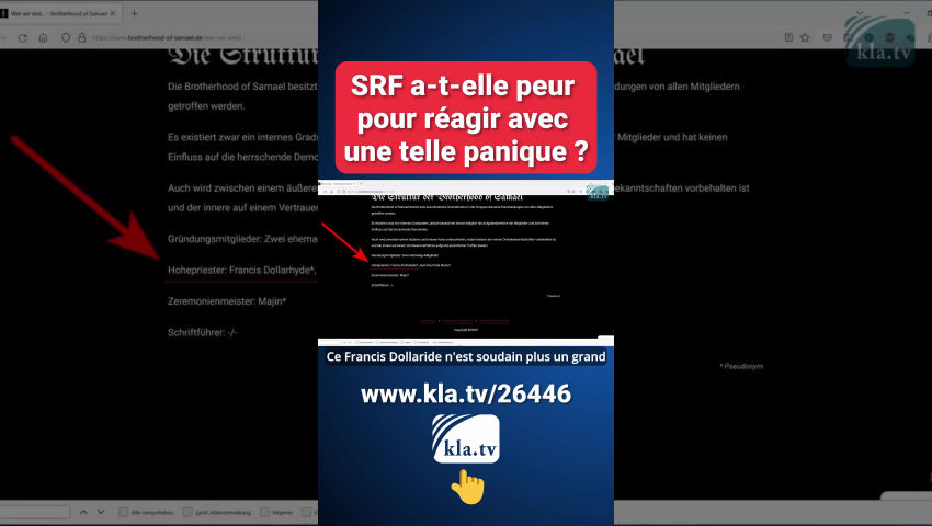 Peu après la diffusion de l'émission d'investigation de Kla.TV " Satanic-Panic : scandale autour de la chaîne suisse SRF et de Robin Rehmann ", Kla.TV a reçu une lettre de menace du service juridique de SRF. Pourquoi SRF est-elle soudain si pressée un dimanche ? Il semble que nous soyons tombés dans le mille avec l’émission de dévoilement sur le journaliste de SRF Robin Rehmann. Les nombreuses preuves tangibles qu'il a des contacts douteux dans les milieux satanistes et bien d'autres choses encore le confirment. Après un bref retrait stratégique, le documentaire de Kla.TV est à nouveau mis en ligne, suivi d'une prise de position de l'auteure Loïs Sasek. Elle réfute souverainement les accusations infondées de SRF. Dans sa prise de position, des révélations supplémentaires donnent encore plus de poids au documentaire de Kla.TV !