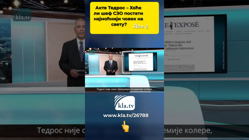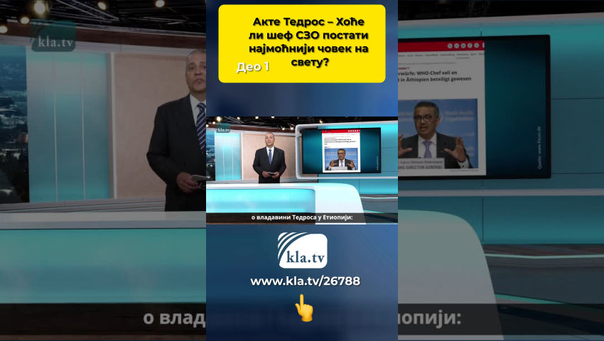 Данас Kla.tv ”под лупом”посматра човека чија овлашћења треба да буду енормно проширена и који онда врло лако може да прогласи нове пандемије широм света. То је Тедрос Адханом Гебрејесус, актуелни генерални секретар Светске здравствене организације. Акте 1: Успон на чело СЗО Према Википедији, Тедрос се 1991. године придружио комунистичком покрету Tig-rayan People's Liberation Front – скраћено ТПЛФ. Након тога, ТПЛФ је владао до 2018. Као члан ТПЛФ странке, Тедрос се уздизао корак по корак. 2005 – 2012: министар здравља Етиопије 2012 – 2016: министар иностраних послова Етиопије Брисантно је то што је ТПЛФ насилна организација са комунистичком агендом. ТПЛФ је наведен као терористичка организација у Глобалној бази података о тероризму од 1976. године, јер је често био укључен у отмице и држање таоца. Током своје скоро 30-годишње владавине, ТПЛФ је починио најтежа кршења људских права. Као члан високог ранга Политбироа и дугогодишњи министар ТПЛФ-а, Тедрос мора бити позван на одговорност за ове злочине! ЗАКЉУЧАК: Тедрос је користио насилну терористичку групу ТПЛФ као одскочну даску за своју каријеру. Ово баца тамну сенку на његов успон! Акте 2: Тешки злочини против људских права! Следећи изводи из званичних годишњих извештаја организација за људска права Amnesty International und Human Rights Watch (HRW) од 2005. до 2016. документују незамисливе злочине етиопске владе под Тедросом: 2007: Владине трупе спаљују цела села, врше јавна погубљења, силују жене и девојчице. 2010: Новинске куће бивају затваране, уредници беже у страху! 2015: Амнести интернешенел извештава о тешким облицима тортуре у локалним полицијским станицама и регионалним затворима, укључујући наношење опекотина и електрошокове. Према извештају британског новинског портала „The Expose“ , ТПЛФ, који је владао од 1991. до 2018. године, био је "један од најкорумпиранијих, најбруталнијих и најгеноциднијих режима који је крочио на планету у последњих 30 година". Као водећи члан овог режима, Тедрос је био саучесник! Укратко, британски новински портал „The Expose“ пише о владавини Тедроса у Етиопији: „Влада ТПЛФ-а је […] извршила небројене масакре. др Тедрос је био саставни део ТПЛФ-а, који је одржавао своју моћ убијајући свакога ко се усудио да критикује његову тактику тлачења. ЗАКЉУЧАК: Најбруталнији злочини над цивилним становништвом за време његовог мандата као одговорног министра извлаче на видело његову бескрупулозност и чине га неподношљивим! Акте 3: Злочини као министар здравља Током свог мандата на месту министра здравља Етиопије, каже се да је више пута игнорисао избијање колере 2006, 2009. и 2011. године. Речено је да је Тедрос вршио притисак на локалне здравствене раднике да опишу колеру која је већ доказано избила као "воденаста дијареја". Према британском новинском порталу The Expose, Тедрос није само прикривао епидемије колере, већ је као одговорни министар здравља био и саучесник у годинама геноцидних блокада хране и лекова за сомалијско становништво у Огадену. Помогао је да се Црвени крст и Лекари без граница истерају из Огадена током многобројног избијања колере, узрокујући смрт безброј људи током низа историјски великих глади и епидемија. ЗАКЉУЧАК: Бројне заташкане епидемије колере и блокирање испоруке помоћи одређеним етничким племенима такође дисквалификују Тедроса за министра здравља! Акте 4: Тедросове везе Многи независни новинари стога д
