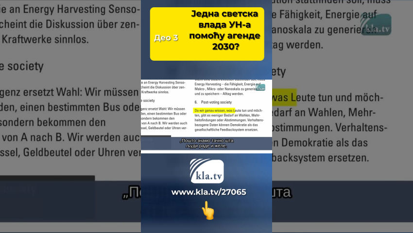У Немачкој се, на пример, такође активно ради на потпуном укидању демократије, како се наводи у документу Савезног министарства унутрашњих послова под називом „Повеља паметног града“. Ово је објављено у мају 2017. и доступно је Kla.TV. Тамо, под насловом „Визија хиперповезане планете“ пише као тачка 6: