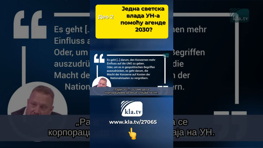 Генерална скупштина Уједињених нација састаће се у Њујорку од 19. септембра до суботе, 23. септембра, и у уторак, 26. септембра 2023. године. Оснивање УН и њена историја Предходник Уједињених нација или УН била је Лига народа, која је основана 1920. после Првог светског рата. Њен званични циљ је био „подстрекнути међународну сарадњу и постизање мира и безбедности“. Дана 18. априла 1946. Лига народа је распуштена на својој 21. скупштини. Замењена је оснивањем Уједињених нација. Према њиховој повељи, обезбеђивање мира у свету остаје један од најважнијих задатака УН. Да ли је то тачно или се под овим велом УН користе за успостављање једне светске владе? Цитат који се односи на Дејвида Рокфелера поставља питања у вези с тим. 1994. године, пред Економским комитетом Уједињених нација, рекао је: „Ми смо на почетку глобалне трансформације, све што нам треба је права свеобухватна криза и нације ће пристати на Нови светски поредак.” Ако је претпоставка да УН помажу у изградњи „једне светске владе“, онда између породице Рокфелер и УН мора постојати веза. УН и породица Рокфелер Занимљиво је знати да је Рокфелерова фондација била кључна у обликовању начина на који је свет организован након Другог светског рата. То су биле студије Council on Foreign Relations , које је финансирала Рокфелерова фондација и на крају су између осталих довеле до стварања Светске банке, НАТО-а и УН-а. Још је претходнику УН, Лиги нација, Џон Д. Рокфелер поклонио библиотеку. Генерални секретар УН-а, Ban Ki-moon је ово поменуо у говору 2012: Џон Д. Рокфелер је такође поклонио имање, 7 хектара на источној обали Менхетна, на које је 24. октобра 1949. године постављен камен темељац за седиште УН у Њујорку. Фондација Рокфелер је заједно са породицом Рокфелер имала и има значајан утицај на стварање и развој УН. То већ показују и везе са последња три генерална секретара УН: Кофи Анан је био генерални секретар УН од 1997. до 2006. године. Добитник је Дејвид Рокфелерове награде, David Rockefeller Bridging Leadership Award, 2009. године. Био је присутан на представљању мемоара Дејвида Рокфелера, а изјава Рокфелерове фондације после његове смрти је гласила: „Кофи Анан је био један од наших најдужих и најјачих партнера“. Бан Ки Мун је био генерални секретар УН од 2007. до 2016. Овде се види како се састаје са Дејвидом Рокфелером. António Guterres је генерални секретар УН од 2017. године. На приказаним фотографијама састаје се са Аријаном Рокфелер и Дејвидом Рокфелером јуниором. Агенда 2030 А сада о агенди 2030 – шта стоји иза ње и које циљеве УН имају са њом? Актуелни састанак служи да се размотри примена агенде 2030 са њених 17 циљева за дугорочни развој. Да ли је досадашња примена агенде 2030 показала да УН желе напредак глобалне заједнице? Или ће њихово спровођење постепено одвести свет у провалију или, другим речима, у једну светску владу? Следе кључне тачке агенде 2030 које би требало детаљније размотрити. 16. кључна тачка је: „Подстицати мирна и инклузивна друштва за дугорочни развој, обезбедити приступ правди за све и изградити ефикасне, одговорне и инклузивне институције на свим нивоима.” Тачка 16.9 каже: До 2030. обезбедити да сви људи имају правни идентитет, посебно путем регистрације рођења. Ова тачка, односно стварање јединственог правног или дигиталног идентитета за све људе на свету, већ је у пуном јеку са ИД2020. ИД2020 планира као допуну државног система транс-национални ди