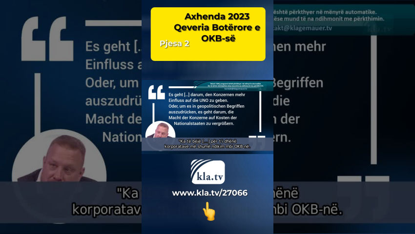 Asambleja e Përgjithshme e Kombeve të Bashkuara do të takohet në Nju Jork nga 19 shtatori deri të shtunën, 23 shtator dhe të martën, 26 shtator 2023. Themelimi i OKB-së dhe historia e saj Paraardhësi i Kombeve të Bashkuara ose OKB ishte Lidhja e Kombeve, e cila u themelua në vitin 1920 pas Luftës së Parë Botërore. Qëllimi i tij zyrtar ishte "të promovonte bashkëpunimin ndërkombëtar dhe të arrinte paqen dhe sigurinë". Më 18 prill 1946, Lidhja e Kombeve u shpërbë në Asamblenë e saj të 21-të të Lidhjes së Kombeve. Ai u zëvendësua nga themelimi i Kombeve të Bashkuara. Sigurimi i paqes botërore mbetet një nga detyrat më të rëndësishme të OKB-së sipas statutit të saj. A është kjo e vërtetë apo po përdoret OKB-ja për të krijuar një qeveri të vetme botërore nën këtë maskë? Një citim që i atribuohet David Rockefeller ngre pyetje në këtë drejtim. Në vitin 1994, para Komitetit Ekonomik të Kombeve të Bashkuara, ai tha: "Ne jemi në prag të një transformimi global, gjithçka që na duhet është kriza e duhur gjithëpërfshirëse dhe kombet do të pajtohen me Rendin e Ri Botëror." Nëse teza është se OKB-ja po ndihmon për të ndërtuar një "qeveri të vetme botërore", familja Rockefeller dhe OKB-ja duhet të lidhen. OKB nënkupton familjen Rockefeller Është interesante të dihet se Fondacioni Rockefeller ishte i rëndësishëm në formësimin e organizimit të botës pas Luftës së Dytë Botërore. Ato ishin studime nga Këshilli për Marrëdhëniet me Jashtë (think tank privat amerikan) që u financuan nga Fondacioni Rockefeller dhe përfundimisht çuan në krijimin e Bankës Botërore, NATO-s dhe OKB-së, ndër të tjera. John D. Rockefeller i kishte dhuruar tashmë një bibliotekë paraardhësit të OKB-së, Lidhjes së Kombeve. Sekretari i Përgjithshëm i OKB-së Ban Ki-moon e përmendi këtë në një fjalim të vitit 2012: John D. Rockefeller dhuroi gjithashtu pronën, 7 hektarë (ekuivalente me madhësinë e 10 fushave të futbollit) në bregun lindor të Manhatan-it, mbi të cilën u vendos gurthemeli për selinë e OKB-së në Nju Jork më 24 tetor 1949. Fondacioni Rockefeller së bashku me familjen Rockefeller patën dhe ka një ndikim të rëndësishëm në fillimin dhe zhvillimin e OKB-së. Këtë e tregojnë vetëm lidhjet me tre sekretarët e fundit të përgjithshëm të OKB-së: Kofi Annan ishte Sekretar i Përgjithshëm i OKB-së nga viti 1997 deri në vitin 2006. Ai është fituesi i çmimit David Rockefeller Bridging Leadership Award 2009. Ai ishte i pranishëm në prezantimin e kujtimeve të David Rockefeller dhe deklarata nga Fondacioni Rockefeller pas vdekjes së tij thoshte: “Kofi Annan ishte një nga partnerët tanë më të gjatë dhe më të fortë.” Ban Ki-moon ishte Sekretar i Përgjithshëm i OKB-së nga viti 2007 deri në vitin 2016. Këtu ai shihet duke takuar David Rockefeller. António Guterres është Sekretar i Përgjithshëm i OKB-së që nga viti 2017. Në fotot e shfaqura ai takohet me Ariana Rockefeller dhe David Rockefeller Junior. Axhenda 2030 Tani për Axhendën 2030 – çfarë qëndron pas saj dhe çfarë synimesh po ndjek OKB-ja me të? Takimi aktual tani shërben për të rishikuar zbatimin e Agjendës 2030 me 17 synimet e saj për zhvillim të qëndrueshëm. A ka treguar zbatimi i kaluar i Axhendës 2030 se OKB-ja dëshiron të promovojë komunitetin global? Apo zbatimi i tij do të çojë gradualisht në rënien e botës në humnerë ose, me fjalë të tjera, në një qeveri të një bote? Në vijim janë pikat kyçe të Axhendës 2030 që duhet të shqyrtohen më në detaje. Pika kryesore e 16-të është: “Promovoni shoqëri paqësore dhe të ngjashme për zhvillim të qëndrueshëm, siguroni akses në drejtësi për të gjithë dhe ndërtoni institucione efektive, të përgjegjshme dhe të ndërlidhura në të gjitha nivelet.” Në nën-pikën 16.9 thuhet: Deri në vitin 2030, sigurohuni që të gjithë njerëzit të kenë një identitet ligjor, veçanërisht përmes regjistrimit të lindjeve. Kjo pikë, pra krijimi i një identiteti uniform ligjor ose dixhital për të gjithë njerëzit në botë, tashmë është në lëvizje të plotë me ID2020. ID2020 po planifikon një identitet dixhital transnacional për të plotësuar sistemet shtetërore. Të gjitha informacionet rreth individit duhet të bashkohen këtu: vërtetimin e trajnimit dhe vaksinimit, gjendjen financiare; Llogaritë në Facebook, të dhëna të prodhuara nga smartphone. Thomas Röper për këtë: Kjo do të thotë se kontrolli total dhe përfundimtar i gjithë njerëzimit është i paketuar [...] me fjalë të bukura. Dhe e gjithë kjo nuk është një fantazi apo një diskutim, këto janë qëllime të vendosura nga OKB-ja,për të cilat po punohet dhe për zbatimin e tyre po shpenzohen miliarda. Lidhja me familjen Rockefeller është gjithashtu e dukshme në ID2020. Fondacioni Rockefeller është një nga organizatat qendrore pas ID2020. Financimi i Axhendës 2030 Sipas deklaratave të veta, OKB-së i duhen pesë deri në shtatë trilionë dollarë në vit për të financuar Axhendën 2030, që është 5,000 deri në 7,000 miliardë dollarë. Sipas OKB-së, për të vënë në dispozicion këto shuma të pafundme, duhet, ndër të tjera, të promovojmë partneritetin publik-privat, një tjetër synim i Axhendës 2030! Partneritetet publiko-private Çfarë do të thotë kjo nëse do të promovohen partneritetet publike-private? Thomas Röper shkon në detaje rreth kësaj në librin e tij dhe shkruan: (S.46) “Ka të bëjë [...] për t'i dhënë korporatave më shumë ndikim mbi OKB-në. Ose, për ta thënë në terma gjeopolitikë, bëhet fjalë për rritjen e fuqisë së korporatave në kurriz të shteteve kombëtare. Korporatat duan të vendosin rregullat dhe nuk duhet t'u binden më ligjeve të shteteve kombëtare. Në terma afatgjatë, ata duan të zhvlerësojnë shtetet kombëtare (dhe ve