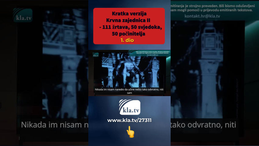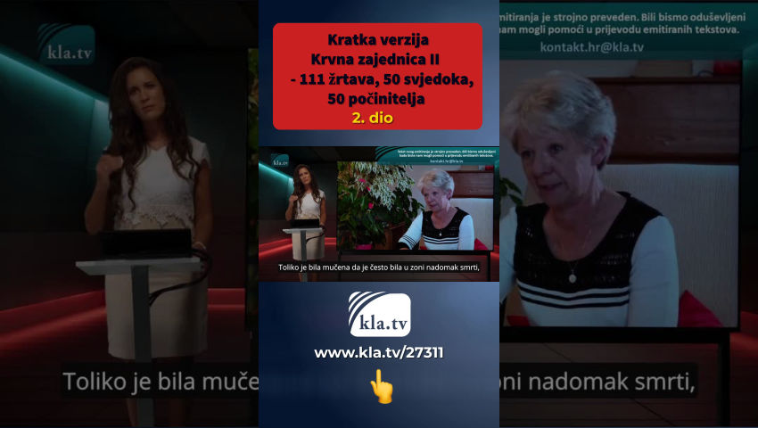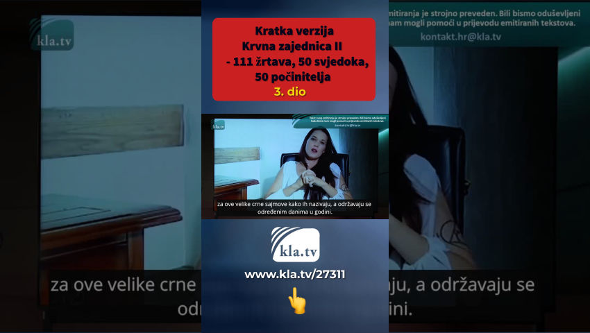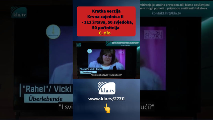 Unatoč masovnim prijetnjama počinitelja, bezbroj drugih preživjelih ritualnog nasilja diljem svijeta prekida šutnju. Lois Sasek sažima mnoge nove žrtve i svjedoke u ovom potpuno novom dokumentarcu. U većini slučajeva oštećeni ne mogu postići nikakav napredak u podnošenju prijava policiji, pravosuđu i državnom odvjetništvu. Unatoč velikom broju neovisnih svjedočanstava, mnogi iz viših krugova i sami su uključeni u te zločine i pokrivaju jedni druge. Stoga je bitno da ova svjedočenja istraže neovisna tijela. Joy, jedna od preživjelih, doziva nas: „Vapite za one koji su pogođeni, da ovo čuju i gluhi! Vrišti, ako možeš!" Pogledajte i dugu verziju videa “Blutsekte 2” na kanalu Kla.tv i proširite ovu eksplozivnu informaciju dalje.
