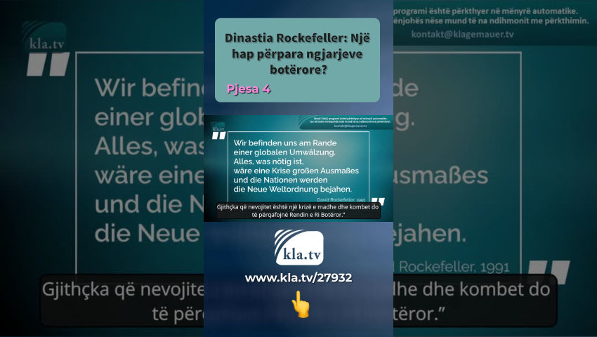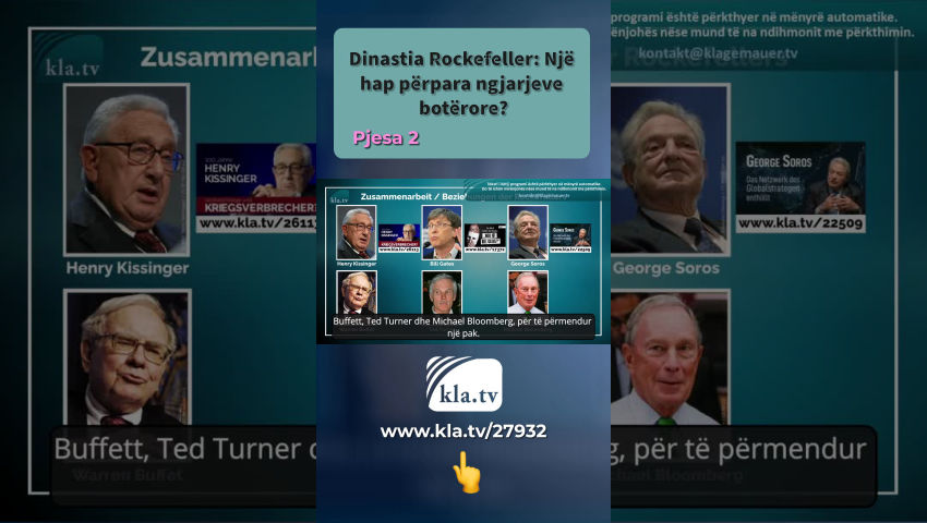 "Rockefeller është padyshim një nga emrat më të famshëm në botë dhe ka zëra të panumërt rreth pasurisë së tij - ose më mirë, pasuria e klanit Rockefeller. Në çdo rast, një gjë mund të jetë e sigurt: Vlerësimet zyrtare të pasurisë së Rokfelerëve janë sigurisht të nënvlerësuara.” Kapitulli "Rockefeller Foundation" i librit "Inside Corona" fillon me këto fjalë. Autori Thomas Röper tregon se Fondacioni Rockefeller ka ende një ndikim të rëndësishëm në ngjarjet botërore sot. Edhe nëse Rokfelerët pothuajse nuk raportohen në mediat kryesore këto ditë, ndikimi i tyre në politikë, OJQ dhe media nuk duhet nënvlerësuar. Kla.TV ka përmbledhur kërkimin e Röper-it për ju dhe e ka plotësuar atë me kërkimet e veta mbi historinë dhe rrjetet globale të dinastisë Rockefeller. Sa është pasuria e Rokfelerëve sot? John Davison Rockefeller Sr., themeluesi i dinastisë Rockefeller, ndërtoi perandorinë e naftës Standard Oil Company në shekullin e 19-të, e cila ishte monopolisti virtual i naftës në Shtetet e Bashkuara në fillim të shekullit të 20-të. Ai konsiderohej si një nga njerëzit më të pasur në histori dhe doli në pension me një pasuri prej afro 900 milionë dollarësh. Kjo pasuri do të ishte me vlerë 300 miliardë dollarë amerikanë sot. Sot, sipas raportimeve të mediave zyrtare, klani nuk është më as në mesin e 600 familjeve më të pasura në botë. Në vend që të rrisin pasurinë e tyre për njëqind vjet, pasuria e tyre thuhet se është zvogëluar gradualisht. Por si mund të jetë kjo? Röper shkruan në librin e tij: “Është jashtëzakonisht e vështirë të vlerësosh me saktësi pasurinë e klanit, pasi ata janë mjeshtër në fshehjen e pasurisë së tyre”. A nuk dinin pasardhësit e sipërmarrësit të fuqishëm amerikan John D. Rockefeller si t'i trajtonin paratë? David Rockefeller, nipi i John D. Rockefeller Senior, është ndoshta figura më e njohur dhe më e rëndësishme në familjen Rockefeller. Deri në vdekjen e tij në 2017, ai mbajti skeptrin e dinastisë familjare dhe pati një ndikim të madh në politikën ndërkombëtare. Mund të supozohet se ai zgjeroi me zgjuarsi fuqinë e familjes në vend që ta zvogëlonte atë. Ai konsiderohej një bankier botëror përkrah Rothsçajlldëve. Në vitin 1960 ai mori drejtimin e Chase Manhattan Bank. Nga mesi i viteve 1970 ajo u bë banka e tretë më e madhe në botë. Në vitin 2000, Chase Manhattan Bank, e kontrolluar nga David Rockefeller, u bashkua me bankën e familjes Morgan për të formuar JPMorgan Chase-in e sotëm. Është banka më e madhe amerikane dhe, sipas revistës së biznesit Forbes, kompania e katërt më e madhe e listuar në bursë në vitin 2022. Familja Rockefeller dhe familja Morgan kishin qenë në kontakt me njëra-tjetrën më së voni që nga fillimi i shekullit të 20-të. Përmbledhur shkurt: Rokfelerët mbajnë marrëdhënie me familjet më të rëndësishme në financa të larta. Për shembull, grupi financiar më i fuqishëm BlackRock. BlackRock është menaxheri më i madh global i aseteve, me 10 trilion dollarë që nga janari 2022. Si vetëm një shembull, David Rockefeller organizoi një drekë për nder të Larry Fink në 2016. Larry Fink është themeluesi, kryetar dhe CEO i BlackRock. Siç shkruante në atë kohë New York Post, në festim ishin të pranishëm miq të tjerë të rëndësishëm nga qarqet e larta financiare. Vetëm këto lidhje tregojnë se pasardhësit e John D. Rockefeller jo vetëm që kanë vetë aftësi të mira financiare - ata gjithashtu kanë kontakte me menaxherët më të fuqishëm dhe më të respektuar të aseteve. Si e morën Rockefellers pasurinë e tyre? Familja Rockefeller fillimisht erdhi nga një vendbanim gjerman i quajtur "Rockefeld", zona e të cilit i përket distriktit të sotëm Neuwied në Rhineland-Pfalz. Familja emigroi në Amerikë në shekullin e 18-të. Ata u bënë të njohur për herë të parë nëpërmjet sipërmarrësit John D. Rockefeller dhe vëllait të tij William, të cilët ndërtuan perandorinë e naftës Standard Oil Company në shekullin e 19-të, e cila u dha atyre një monopol virtual të naftës në SHBA në fillim të shekullit të 20-të. Rockefeller mund të vendosë çmimin e naftës sipas dëshirës dhe të grumbullojë para dhe fuqi. Prandaj, kandidati presidencial Theodore Roosevelt premtoi se do të ndërmerrte veprime kundër monopolit Rockefeller nëse zgjidhej. Më 15 maj 1911, Gjykata e Lartë e Shteteve të Bashkuara urdhëroi ndarjen e kompanisë, duke shkaktuar rënie të ndjeshme të çmimit të aksioneve të saj. Standard Oil u nda në 34 kompani të vogla. Duke supozuar se çmimi i aksionit do të rikuperohej, Rockefeller bleu blloqe aksionesh në secilën kompani. Sipas vlerësimeve konservatore, ai fitoi 200 milionë dollarë nga rritja e mëvonshme e çmimit të tregut të aksioneve; e cila në vitin 1901 korrespondonte me një vlerë aktuale prej afërsisht 7.3 miliardë dollarë amerikanë. Praktikisht të gjitha kompanitë e sotme të naftës në SHBA dolën nga “ndarja” e Standard Oil. Siç raportuan NTV dhe media të tjera në vitin 2016, fondacionet Rockefeller kishin hequr dorë nga investimet e tyre në lëndët djegëse fosile për shkak të kërcënimit të ndryshimeve klimatike. Sipas Röper, megjithatë, nuk ka asnjë provë për një ndarje nga letrat me vlerë në një shkallë të gjerë. Një gjë është e sigurt: ndarja e kompanisë i shërbeu Rockefellers për të zgjeruar më tej fuqinë e tyre dhe për të grumbulluar më shumë pasuri. Çfarë strategjie po ndjekin Rokfelerët? Henry Kissinger, ish-sekretari amerikan i Shtetit, përmblodhi strategjinë globale të David Rockefeller në vitet 1970 si më poshtë: “Kur ju kontrolloni naftën, ju kontrolloni kombe të tëra; kur ju kontrolloni ushqimin, ju kontrolloni njerëzit; Nëse ju kontrolloni paratë, ju kontrolloni të gjithë botën.” Dinas