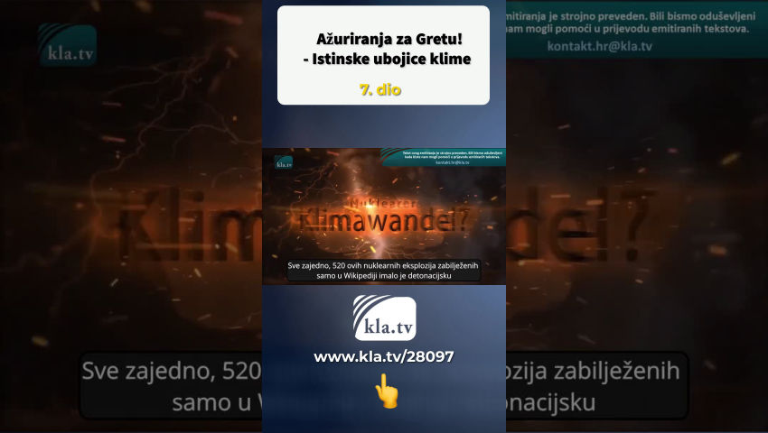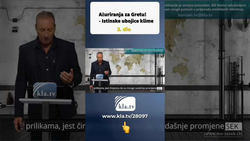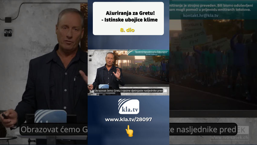 Donedavno mi nije bilo jasno kako pola svijeta može slijediti klimatske slogane Grete Tunberg, dok je na licu tada tek 15-godišnjeg djeteta pisalo da ta nova prisilna klimatska religija nikako nije mogla doći od nje., niti iz nje vlastite glave ili uma. Svatko pod ovim nebom trebao bi odmah shvatiti da je do sada samo jadno, bolesno malo ljudsko dijete iskorišteno od strane moćne elite i zloupotrijebljeno za svoje ciljeve. Ali ono što do sada gotovo nisam mogao razumjeti je da su tolika, ali očito savršeno zdrava djeca, mladi ljudi, pa čak i odrasli, dopustili da budu iskorišteni zajedno s ovom zlostavljanom Gretchen. Barem bi ovi normalni i misleći ljudi trebali moći prozrijeti, mislio sam, da ih samo iskorištavaju veliki lopovi. Sada ću vam objasniti kako smo mi kao Kla.TV dopustili da nas iskoriste ti klimatski zločinci – i što smo iz toga naučili. Visokopozicionirani klimatolozi i znanstvenici su na najboljim i najuvjerljivijim primjerima pokazali da postoji potpuno prirodna promjena klime, stalno podizanje i dolje i nazad i naprijed temperatura, vjetrova i vremenskih uvjeta itd., tisućama godina. I to je točno.