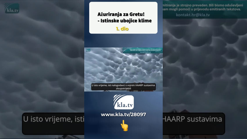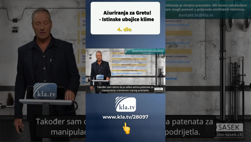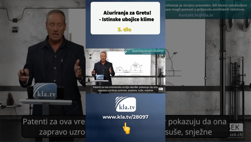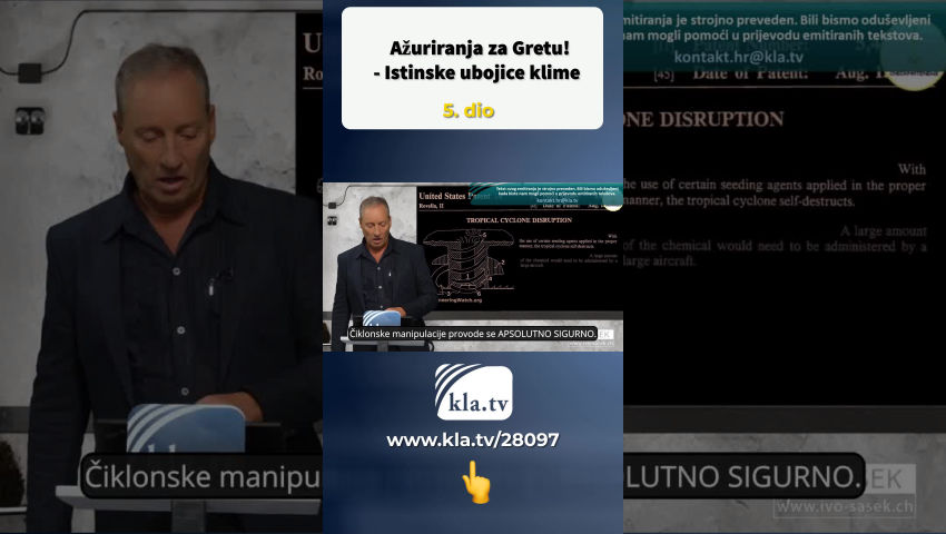 Danas imam važno upozorenje za sve slobodne svjetiljke u vezi s klimatskim promjenama koje je uzrokovao čovjek. Donedavno mi nije bilo jasno kako pola svijeta može slijediti klimatske slogane Grete Tunberg, dok je na licu tada tek 15-godišnjeg djeteta pisalo da ta nova prisilna klimatska religija nikako nije mogla doći od nje., niti iz nje vlastite glave ili uma. Svatko pod ovim nebom trebao bi odmah shvatiti da je do sada samo jadno, bolesno malo ljudsko dijete iskorišteno od strane moćne elite i zloupotrijebljeno za svoje ciljeve. Ali ono što do sada gotovo nisam mogao razumjeti je da su tolika, ali očito savršeno zdrava djeca, mladi ljudi, pa čak i odrasli, dopustili da budu iskorišteni zajedno s ovom zlostavljanom Gretchen. Barem bi ovi normalni i misleći ljudi trebali moći prozrijeti, mislio sam, da ih samo iskorištavaju veliki lopovi. Sada ću vam objasniti kako smo mi kao Kla.TV dopustili da nas iskoriste ti klimatski zločinci – i što smo iz toga naučili. Visokopozicionirani klimatolozi i znanstvenici su na najboljim i najuvjerljivijim primjerima pokazali da postoji potpuno prirodna promjena klime, stalno podizanje i dolje i nazad i naprijed temperatura, vjetrova i vremenskih uvjeta itd., tisućama godina. I to je točno. Međutim, što smo uvjerljivije uspjeli dokazati da klimatske promjene nikako ne mogu biti uzrokovane čovjekom, to smo više izravno išli na ruku tim kreatorima klimatskih kriza! I vidite, ova stalna naprijed-natrag, ova borba snage na ovoj preniskoj razini, bez obzira jesu li klimatske promjene uzrokovane čovjekom ili ne, apsolutno je namjerno ometanje prema kojem su nas ove pametne klimatske lisice dovele. No, ono što mi je tek ovih dana postalo jasno uvidom u visoko rangirane patente manipulacije vremenskim prilikama, jest činjenica da su mnoge sadašnje promjene našeg vremena i "klime" zapravo izazvane čovjekom! Ali ne od strane nesuđenih ljudi kao što smo ti i ja, dakle ljudi iz običnog puka, već od strane beskrupuloznih neprijatelja čovječanstva na najvišem nivou! Ni kroz naše sustave grijanja, ni kroz ispušne plinove naših automobila ili industrije! I naravno ne nikakvim kravljim prdežima, koji su također krivi za ozonske rupe. Ne, možete se vlastitim očima uvjeriti u nebrojene patente koji postoje već desetljećima da geoinženjering, odnosno razne tehnike manipuliranja vremenskim prilikama, između ostalog, uzrokuju ozonske rupe. Patenti za ova vremenska oružja također pokazuju da ona zapravo uzrokuju potrese, poplave, suše, snježne oluje, munje sa i bez grmljavine ili toplinske valove, hladnoću, olujne vjetrove pa čak i tornada. Da, čak i tsunamiji za koje tada nitko nije znao i sve druge strašne stvari koje smo morali doživjeti u proteklim desetljećima su ovdje navedeni! Službeni američki patent 4686605 prikazan u pozadini točno opisuje kako se iznimno opasno elektromagnetsko HAARP oružje može koristiti za stvaranje topline ili šumskih požara! I kad sam pregledavao razne takve patente, postalo mi je jasno da takvi patenti koštaju mnogo novca i da se odobravaju samo ako tehnologije za koje se prijavljuje stvarno rade. Također sam otkrio da je velika većina patenata za manipulaciju vremenom vojnog podrijetla. Samo između 1947. i 1978. Kongres SAD-a je odobrio 110 programa manipulacije vremenskim prilikama. Godine 1962. LYNDON B. JOHNSON (dostupan originalni audio zapis) rekao je: “Ovo će omogućiti ljudima da odrede sloj oblaka na Zemlji i konačno kontroliraju vremenske prilike. A tko god kontrolira klimu, kontrolirat će svijet." Ali onda sam vidio sve te brojke, koliko se milijuna tona nanofine čestice prašine i čađe redovito upumpava u naše nebo. Sedamdesetih godina prošlog stoljeća američko zrakoplovstvo stvorilo je pojam chemtrails. Kada su prvi neovisni istražitelji doznali za ovaj tajni zločin protiv čovječnosti, CIA je odmah počela diskreditirati te ljude kao teoretičare zavjere. Kada je 2008. Werner Altnickel na 1. AZK-u iznio stotine dokaza o takvim chemtrail operacijama u vezi s HAARP-om i mikrovalnom tehnologijom, juriš na njega i sve suvremene svjedoke ne samo da se nastavio, nego je i dobio na zamahu. Tek nakon što su tisuće nepobitnih dokaza dospjele u javnost, ne samo Wikipedija, već i sve vrste vladinih i znanstvenih web stranica službeno su priznale da chemtrail tehnologija postoji desetljećima, samo što se od sada dosljedno odnosila samo na geo-inženjering. Ovo iznenadno opće popuštanje u korištenju novog tehničkog izraza ni na koji način nije oslobodilo, opravdalo ili čak rehabilitiralo osramoćenu reputaciju onih koji su otkrili chemtrailse. Upravo suprotno: teoretičari zavjere samo ih još više tjeraju u kut i jednostavno tvrdoglavo tvrde da geoinženjering nije širenje zagađivača, već jednostavno implementacija povoljnih vremenskih promjena za dobrobit čovječanstva... I tako je narativ osmišljen na takav način da imate na umu samo dobrobit ljudi. Međutim, ono što je kristalno jasno iz mnogih od ovih otkrivenih patenata je upravo suprotno: Prema stručnjaku za geoinženjering? Dane Wigington, čak se i tornadima i uraganima manipulira. Čiklonske manipulacije provode se APSOLUTNO SIGURNO. Američka vojska je uključena u programe manipulacije uraganom od najmanje 1947. godine - do danas. Prema Daneu Wigintonu, klimatski inženjering dokazano je najveći uzročni čimbenik sve većeg broja šumskih požara. Diljem svijeta prisiljeni smo koristiti sve skuplje filtere za finu prašinu kako bismo spriječili čestice čađe koje su štetne za klimu izvan dizelskih vozila i slično. Dok geoinženjeri poput Dr. David Keith i Dr. Ken Caldeira inzistira na tome da se do 20 MILIJUNA tona nanočestica aluminija otpuhne u globalno nebo svake godine. Jeste li to dobro razumjeli? Zrakoplovi već dugo ispuštaju milijune tona toksičnih tvari u zrak svake godine, uključujući čestice čađe i brojne smrtonosne kemikalije u obliku nanočest