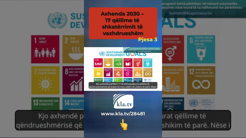 [AGJENDA e OKB-së 2030] Axhenda 2030, e cila u shpall në Samitin e Kombeve të Bashkuara në Nju Jork në 2015, është një traktat global për të ardhmen që qeveritë kombëtare duhet t'i nënshtrohen. Kjo axhendë përfshin 17 të ashtuquajturat qëllime të qëndrueshmërisë që duken të mira vetëm në shikim të parë. Nëse i shikoni më në detaje, gjithmonë ktheheni te të njëjtët aktorë që në realitet nuk duan asgjë më pak se kontroll të plotë mbi burimet e tokës sonë - një qeveri e vetme qendrore botërore dhe si rrjedhim skllavërimin e të gjithë popujve.
