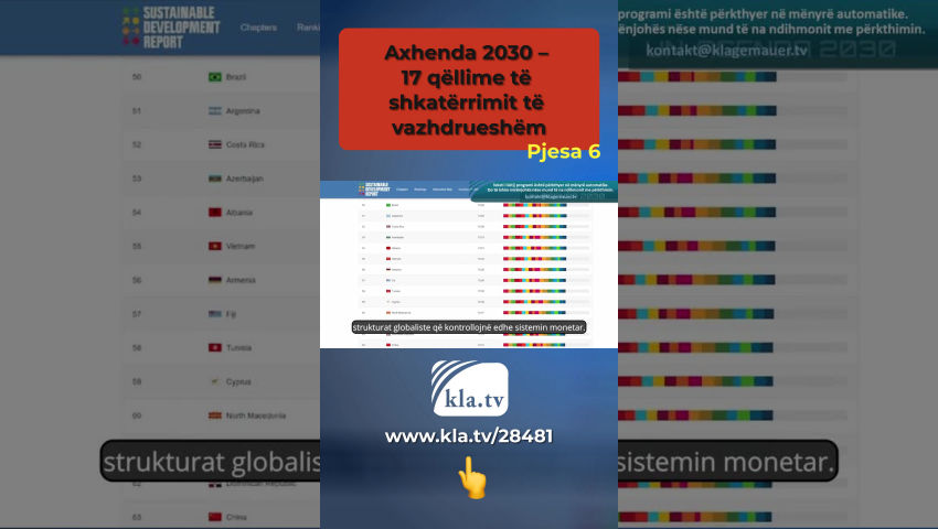 Njerëzimi po tronditet nga krizat ekzistenciale. Asnjë fushë e jetës nuk kursehet. Pavarësisht nëse ekonomike, financiare, politike, etike, mjekësore apo sido që dëshironi ta quani atë: Sikur nuk duhet lënë gur pa lëvizur. Por si ndodh kjo? Çfarë, ose më mirë, kush qëndron pas saj? Këtu kërkohet një vështrim investigativ dhe një mendim i palëkundur nëse nuk doni të humbisni në valët gjithnjë në rritje. Dokumentari i mëposhtëm 30-minutësh nga shoqata zvicerane WIR hedh dritë mbi këtë kaos dramatik: Kriminelët më të këqij kanë depërtuar në pozicione drejtuese në të gjitha format e organizimit të bashkëjetesës njerëzore dhe po ndjekin axhendën e tyre një-botërore 2030, e cila përçmon njerëzit dhe skllavëron popujt. [AGJENDA e OKB-së 2030] Axhenda 2030, e cila u shpall në Samitin e Kombeve të Bashkuara në Nju Jork në 2015, është një traktat global për të ardhmen që qeveritë kombëtare duhet t'i nënshtrohen. Kjo axhendë përfshin 17 të ashtuquajturat qëllime të qëndrueshmërisë që duken të mira vetëm në shikim të parë. Nëse i shikoni më në detaje, gjithmonë ktheheni te të njëjtët aktorë që në realitet nuk duan asgjë më pak se kontroll të plotë mbi burimet e tokës sonë - një qeveri e vetme qendrore botërore dhe si rrjedhim skllavërimin e të gjithë popujve. Për të ushtruar ndikim në të gjitha fushat e jetës dhe strukturave, këto synime po promovohen jo vetëm nga vetë Kombet e Bashkuara, por edhe nga partnerë me ndikim si Forumi Ekonomik Botëror dhe Rivendosja e Madhe e tij. Për më shumë se 50 vjet, WEF ka lidhur njerëzit më me ndikim nga politika, biznesi, shkenca, media, sindikatat, OJQ-të, kultura dhe kishat dhe i ka bashkuar ata me njerëzit më të pasur në botë. Ajo gjithashtu ka edukuar elitën e korporatave dhe politike në botë për më shumë se 30 vjet. Qoftë Bill Gates, Jeff Bezos, Angela Merkel, Emmanuel Macron, Viktor Orban apo Vladimir Putin. Ata të gjithë kaluan në shkollën WEF si Udhëheqës të Rinj Global. Nuk është çudi, pra, që themeluesi i forumit, profesori gjerman Klaus Schwab, konsiderohet si një nga personalitetet më me ndikim të sotëm. Agjenda e Kombeve të Bashkuara 2030 – një program 17-pikësh për dominimin e botës dhe skllavërimin e të gjithë popujve 1. Luftoni varfërinë në të gjitha format e saj Popuj të tërë dhe ekonomitë e tyre po shkatërrohen qëllimisht dhe po bëhen të varura nga qeveritë për t'i çuar viktimat në një përzierje të socializmit dixhital dhe komunizmit. Qëllimi është që të centralizohen të gjitha asetet dhe burimet, t'i regjistrohen ato në mënyrë dixhitale dhe vetëm t'i shpërndajë ose t'i bëjë ato të aksesueshme në kushte të caktuara. Por për ta bërë këtë, njerëzit duhet të jenë të përgatitur që t'i nënshtrohen plotësisht kompleksit industrial dixhital. 2. T'i jepet fund urisë, të arrihet siguria ushqimore dhe ushqimi i përmirësuar dhe të promovohet bujqësia e qëndrueshme Qëllimi është shkatërrimi i bujqësisë. Meqenëse fermerët janë bërë të varur nga subvencionet, globalistët tani e kanë të lehtë. Kërkesa të reja po krijohen vazhdimisht që fermerët nuk mund t'i plotësojnë, duke i lënë ata pa mundësi për të menaxhuar biznesin e tyre. Gjithnjë e më shumë kompani po zhduken. Synimi është që i gjithë sektori bujqësor i një vendi të merret përsipër nga korporata dhe investitorë të mëdhenj ndërkombëtarë. Ata mund të përdorin inxhinierinë gjenetike dhe metoda të tjera të dëmshme, ose vetëm të prodhojnë ushqim inferior, ose thjesht ta lënë tokën djerrë për të krijuar mungesa ushqimore. Kushdo që ka sovranitet mbi ushqimin kontrollon njerëzimin. 3. Sigurimi i një jete të shëndetshme për të gjithë njerëzit e të gjitha moshave dhe promovimi i mirëqenies së tyre Fokusi është në dixhitalizimin dhe centralizimin e të gjitha standardeve mjekësore nga OBSH. Organizata Botërore e Shëndetësisë mund të vendosë masa mjekësore në të gjithë botën nën kërcënimin e gjobave dhe sanksioneve. Për këtë qëllim, përgjegjësia për masat mjekësore të të gjitha llojeve hiqet nga qeveritë kombëtare. OBSH do të përdorë të ashtuquajturin traktat të pandemisë për të vendosur në mbarë botën se kur dhe ku do të urdhërohen masat e detyrueshme si maskat, vaksinimet, testet, bllokimet dhe karantina. Gjithashtu, të gjitha të dhënat shëndetësore do të ruhen në një bazë të dhënash ndërkombëtare dhe do të lidhen me identitetin dixhital të të gjithë qytetarëve. Industria e kujdesit shëndetësor duhet të sillet në përputhje në mbarë botën. Të gjitha opinionet dhe rezultatet e hulumtimit në mjekësi që devijojnë nga OBSH-ja shtypen, persekutohen dhe kriminalizohen sistematikisht. Procedurat naturopatike duhet të ndalohen nga sektori shëndetësor dhe të zëvendësohen me kurse trajnimi, produkte dhe shërbime nga industria farmaceutike dhe kimike. Shëndeti i njerëzve atëherë është tërësisht në duart e OBSH-së, pasi të dhënat e dukshme shëndetësore e lejojnë atë të ndërhyjë rregullisht nëse njerëzit sillen në një mënyrë të papajtueshme. Kjo mund të çojë që njerëzve t'u mohohet qasja në ushqim dhe mjekime të nevojshme nëse ata sillen në mënyrë jonormale. 4. Sigurimi i arsimit cilësor gjithëpërfshirës dhe të barabartë dhe promovimi i mundësive të të mësuarit gjatë gjithë jetës për të gjithë Barazimi global i sistemeve arsimore dhe standardizimi i propagandës për të garantuar të njëjtën thellësi indoktrinimi për fëmijët dhe të rinjtë kudo. Duhet të ketë një edukim thelbësor të përbashkët, Edukim i përbashkët bërthamë. Pra, një rregullore me përmbajtje ideologjike të sforcuar që duhet programuar në të gjithë njerëzit. Kjo çon në një riedukim totalitar në frymën e elitave, ku n