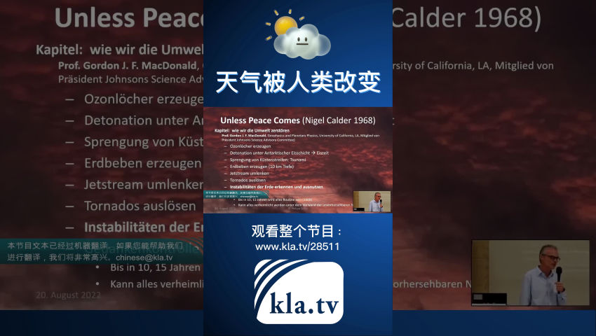 亲爱的观众朋友们,你们对天气操纵了解多少?这个话题在你们的环境中是否也存在争议,是否经常被当作阴谋论?下面是一位自然科学博士在达沃斯 2022 年夏季会议 WEFF上的发言,在这方面很有启发。 Philipp Zeller 的演讲:夏季 WEFF 22 地球工程: 地球工程当然是一个中性得多的术语,地球工程主要是操纵天气,这其实是最重要的,即向大气层释放微粒,同时也向大气层释放强大的电磁波。当然,地质勘探是指改变地球、对地球进行工程勘探。这意味着要探测空洞、油藏、天然气等。实际上,我一开始几乎不愿意相信,你可以通过这些活动人为地引发地震。最后,地球磁场也可以被操纵,尤其是利用上述电磁射线。为什么要实施地球工程?这实际上要追溯到第二次世界大战后开始的整个冷战时期。积云项目,1952 年在英国导致了一场严重的洪水灾难,当时为了人工制造云层并使其降雨,对云层进行了接种。这场洪水灾害非常严重,有 34 人死亡,许多房屋被洪水冲走。 然后是 "大力水手 "项目,这可能是大多数人都知道的,在越南战争期间,有人故意制造大量降雨,以泥泞和阻止越共的补给路线。最后,我还想提醒大家,曾经进行过 2000 多次原子弹试验。现在,我将回到美国,向大家展示另一份已公布的文件,这是向美国空军提出的 2025 年展望建议。文件本身是 1996 年的,标题是:"天气是力量的倍增器"。副标题是:"2025 年之前,天气归我们所有"。用雨水、潮汐破坏敌人,这也会使另一方的士兵士气低落。但你也可以挑起旱灾,造成缺水,直到人民严重缺水而投降。您可以让雾和云消散,让敌人无处藏身,也可以形成雾和云,让敌人措手不及。您还可以识别敌人本身是否在使用此类技术。最安全和最便宜的方法是喷气发动机的一种后燃烧器,即在发动机后面安装一个喷射装置,将碳尘引入排气喷射器。当飞机飞过这个区域时,这个装置就会被激活或再次停用。您可以通过形成冰晶来制造冷云,也可以通过人为地用微粒扩大现有水滴来制造暖云。您可以制作不降雨的干云,就像我们这几天经常遇到的那样。您可以增大雷暴周围的云层,以改变、加强或削弱风暴。你可以投下金属箔或金属微粒--在他的时代,它们还是金属箔--来产生更多的闪电。换句话说,闪电发生时,实际上并没有下雨,也没有雷雨。这一点我们很清楚。你可以制造飓风,你可以用聚合物层阻止水面蒸发,这样即使温度升高也不会有云。更多的水实际上会蒸发掉。你可以改变全球气候,他写道,全球气候会自然改变,因此你可以很好地隐藏这些活动。没有人会意识到这是自然现象还是幕后黑手。这还不是全部,我还有第二页。你可以制造臭氧洞。在南极冰层下进行地下核爆试验,是进行核爆的绝招。南极冰盖厚约 100 公里,冰量惊人。这层冰下的热量会形成一层水膜,其中很大一部分冰会像滑滑梯一样滑入海中。你可以炸毁沿海地带,然后引发海啸。我不知道谁在 1968 年就知道什么是海啸。我是从 2006 年才知道的,尽管在那之前我学的是物理。激活地下约 10 公里深的水层就能产生地震。 1999 年,欧洲委员会起草了一份 35 页的报告。这是欧洲委员会的一个特别委员会。报告是关于所谓的 HAARP 项目。有两个A,意思是 "高频主动极光研究计划"。欧洲委员会或欧盟委员会写道,它是电磁武器的一部分,对整个环境,当然也对人类健康构成高度危险的威胁,因为该项目旨在穿透整个生物圈的高敏感能量区。现在有很多这样的无线电波发射站,它们肯定会对我们所有人的健康产生影响。然后,我还可以利用这种电磁辐射来迷惑、偏转甚至摧毁导弹。这是一种武器系统。这就是美国在 20 世纪 90 年代宣传的 "星际战争"。该专利还指出,臭氧或氮气的浓度是可以改变的。你可以改变二氧化碳的浓度。一氧化碳--甚至更加危险。换句话说,吸引水的烟雾会吸引水蒸气。据说需要一种含有以下元素的金属混合物: 锂、钠、钾、铯、铷、钙、镁、锶和钡的碳酸盐,以及它们的混合物。此外,轻金属如铝、镁、锌或锆或它们的混合物。还有无机氧化剂,如硝酸盐、高氯酸盐、钠、锂、钾、钙、钡和锶。前面已经提到,铝是当今大气中最常见的污染物之一。 我想说的另一项研究来自《社会科学研究进展》杂志,研究对象是加利福尼亚的红杉,这些红杉林。其中一些已有 3000 多年的历史。它们经历的气候比我们声称的或今天实际拥有的气候要温暖得多。它们经历过令人难以置信的干燥期、潮湿期和寒冷期。它们仍然活着,现在却都在消亡。仔细观察就会发现,加州长达数十年的人为干旱是由地球工程造成的。有毒的纳米粒子显然会导致树木死亡。因此,我们并不是说臭氧层的空洞越来越大。我们现在知道它是如何扩大的了。主流科学也承认,我们体内的 UVB 和 UVC 含量要高得多。这是危险的紫外线,波长从 100 纳米到大约 400 纳米。这才是真正危险的紫外线。过去地球表面没有这种紫外线。它是通过臭氧层的空洞来到我们身边的。灾难性的蜜蜂死亡、昆虫死亡以及所有的藻类问题。这些有毒藻类的大量繁殖实际上是因为浮游生物的死亡。所有这些纳米粒子污染和臭氧层空洞。鸟类数量正在减少,这也是间接原因,因为昆虫正在消失,蝙蝠也是如此。这些都是我读过的研究报告。它们对整个环境的影响,而不仅仅是对我们的健康的影响,确实非常可怕。