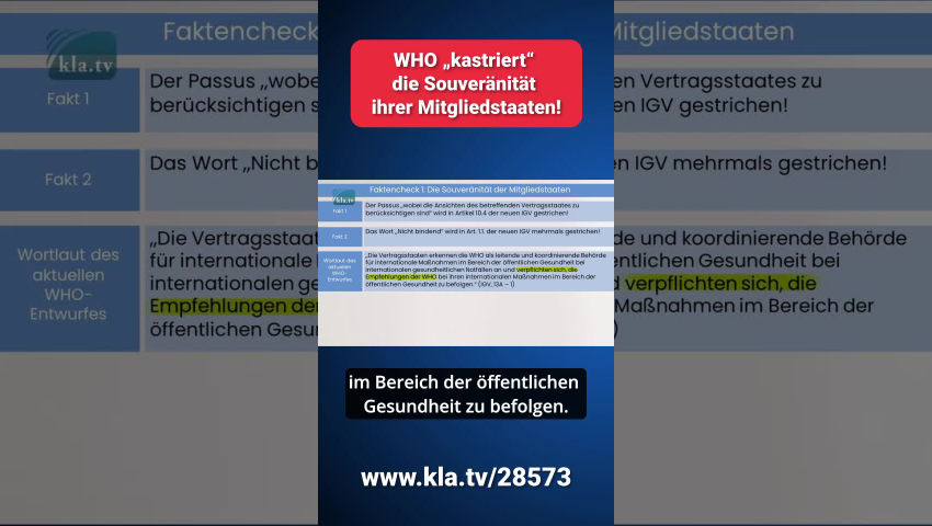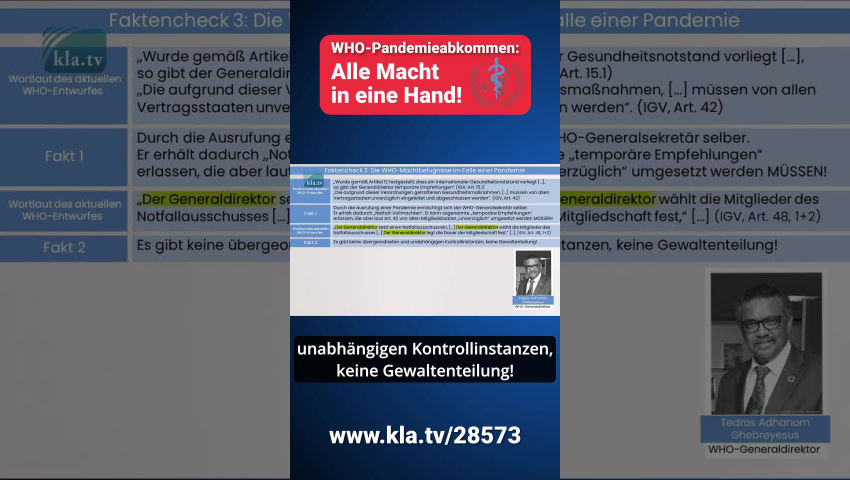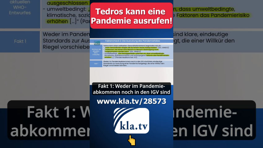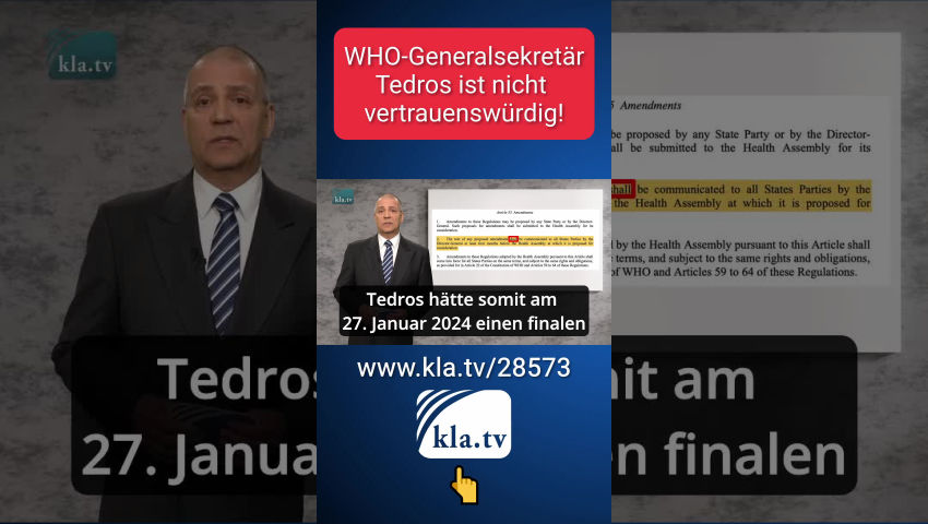 Tedros hält sich nicht an Vorschriften und ist somit nicht vertrauenswürdig! Faktencheck1: Die Souveränität der Mitgliedstaaten „Die aufgrund dieser Verordnungen getroffenen Gesundheitsmaßnahmen, […] müssen von allen Vertragsstaaten unverzüglich eingeleitet und abgeschlossen werden“. (IGV, Art. 42) Niemals darf ein Mann derartige Machtbefugnisse über Leib und Leben von Milliarden von Menschen in den 194 Mitgliedsstaaten der WHO bekommen! Das „Geschäftsmodell“ WHO Gigantische Finanztransaktionen, die vom Steuerzahler zu entrichten sind, fließen somit in ärmere Länder und landen letztlich in den Taschen von „Big Pharma“ und privaten Investoren. Hier kommt ans Licht, wie heimtückisch die WHO und ihre finanzstarken Profiteure im Hintergrund einen „Staatsstreich“ in 194 Ländern eingefädelt haben! Delegierte aus 194 Mitgliedsstaaten sollen auf der Generalversammlung der WHO in Genf vom 27.05. - 01.06.2024 über einen neuen Pandemievertrag und eine grundlegende Reform der bereits bestehenden Internationalen Gesundheitsvorschriften – kurz: IGV – abstimmen. Da diese über eine bedeutende Erweiterung der Machtbefugnisse der WHO und dessen Generaldirektor Tedros Adhanom Ghebreyesus abstimmen sollen, ist nun in nahezu allen Ländern bereits Monate vor der Versammlung eine heftige Debatte entbrannt. In Artikel 55 der IGV verpflichtet sich Tedros dazu, allen Mitgliedsstaaten den Wortlaut jeder vorgeschlagenen Änderung mindestens vier Monate vor der Abstimmung zu übermitteln. Das englische Wort „shall“ muss an dieser Stelle als imperativer Befehl übersetzt werden. Die Bekanntgabe ist somit obligatorisch, zwingend. Tedros hätte somit am 27. Januar 2024 einen finalen Textentwurf vorlegen müssen, um eine satzungsgemäße Abstimmung zu ermöglichen. Dies ist bis März 2024 nicht erfolgt, Tedros hält sich nicht an Vorschriften und ist somit nicht vertrauenswürdig! Unsere heutige kla.tv-Recherche, die von internationalen Experten unterstützt wurde, kann daher nur die aktuellen Entwürfe der beiden Dokumente, über die derzeit noch diskutiert wird, unter die Lupe nehmen. Für diese Recherche werfen wir einen Blick nach Deutschland – einen der 194 Mitgliedsstaaten: Am Donnerstag, den 22. Februar 2024 wurde ein Antrag der CDU/CSU-Fraktion im Deutschen Bundestag vorgestellt. Er trägt den Titel: „Für transparente Verhandlungen über das WHO-Pandemieabkommen – Gegen Fehlinformationen und Verschwörungstheorien“. Die CDU/CSU ist die größte Oppositionsfraktion und formulierte darin verschiedene Forderungen an den WHO-Pandemievertrag. Diese Forderungen werden im Folgenden in einem Faktencheck dem Wortlaut der Vertragsentwürfe für die beiden Abkommen gegenübergestellt. Dieser Faktencheck bringt – quasi schwarz auf weiß – ans Licht der Öffentlichkeit, worüber die WHO derzeit hinter verschlossenen Türen verhandelt: Faktencheck1: Die Souveränität der Mitgliedstaaten Forderung der CDU/CSU: „Darüber hinaus muss sichergestellt werden, dass die Umsetzung des Abkommens in Übereinstimmung mit den nationalen Gesundheitspolitiken der Mitgliedstaaten erfolgt und einzelstaatliche Souveränitätsrechte vollumfänglich bestehen bleiben.“ Fakt 1: Der Passus „wobei die Ansichten des betreffenden Vertragsstaates zu berücksichtigen sind“ wird in Artikel 10.4 der neuen IGV gestrichen! Fakt 2: Das Wort „Nicht bindend“ wird in Art. 1.1. der neuen IGV mehrmals gestrichen! Wortlaut des aktuellen WHO-Entwurfes „Die Vertragsstaaten erkennen die WHO als leitende und koordinierende Behörde für internationale Maßnahmen im Bereich der öffentlichen Gesundheit bei internationalen gesundheitlichen Notfällen an und verpflichten sich, die Empfehlungen der WHO bei ihren internationalen Maßnahmen im Bereich der öffentlichen Gesundheit zu befolgen.“ (IGV, 13A – 1) Fakt 3: Durch den neuen Artikel 13A – 1 verpflichten sich die 194 Mitgliedstaaten, die Empfehlungen der WHO zu befolgen! Diese diktatorischen Vertragsentwürfe sind skandalös und entlarven die wahren Absichten der WHO! Die WHO ist keine vertrauenswürdige Organisation - selbst wenn sie aufgrund des immer stärker werdenden internationalen Druckes die Entwürfe in letzter Minute noch abschwächen sollte! Bewertung: Wie mit einem Skalpell „kastriert“ die WHO die Mitgliedstaaten! Durch Weglassen bzw. Hinzufügen einzelner Worte entfernt sie deren Souveränität und ermächtigt sich selber! Aus den bisherigen nicht-verbindlichen Empfehlungen werden dadurch völkerrechtlich verpflichtende Handlungsanweisungen! Faktencheck 2: Die Ausrufung des Pandemiefalles Forderung der CDU/CSU: „Ungeklärt bleibt auch, ob der WHO-Generaldirektor künftig Pandemien ausrufen darf, während er aktuell nur eine „gesundheitliche Notlage internationaler Tragweite“ erklären kann, die an strenge Kriterien geknüpft ist.“ „Weiterhin soll das Abkommen unter anderem Kriterien zur Ausrufung einer Pandemie festlegen, […]“ Wortlaut des aktuellen WHO-Entwurfes Tedros kann einen weltweiten Gesundheitsnotstand begründen mit z.B.: - „einer menschlichen Grippe, die auf einem neuen Subtyp basiert“ (IGV, ANNEX2) oder - „Infektionen, bei denen eine Mensch zu Mensch-Übertragung nicht ausgeschlossen werden kann“ (IGV, ANNEX2) oder sogar umweltbedingt: - „Die Vertragsparteien erkennen an, dass umweltbedingte, klimatische, sozioökonomische und anthropogene Faktoren das Pandemierisiko erhöhen […]“ (Pandemieabkommen 4.5) Fakt 1: Weder im Pandemieabkommen noch in den IGV sind klare, eindeutige Standards zur Ausrufung einer Pandemie festgelegt, die einer Willkür den Riegel vorschieben könnten. „Der Generaldirektor bestimmt auch, ob ein gesundheitlicher Notfall von internationalem Interesse auch einen pandemischen Notfall darstellt.“ (IGV, Art. 12 (5)) Fakt 2: Generaldirektor Tedros kann laut dem neuen Artikel 12, Absatz 5 bzw. auch Absatz 1 der IGV zukünftig sogar Pandemien ausrufen! Bewertung: Die