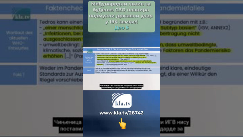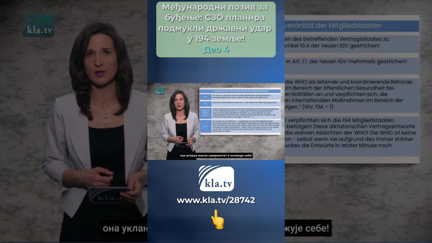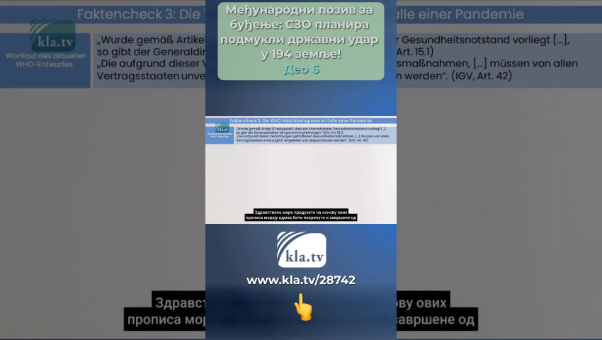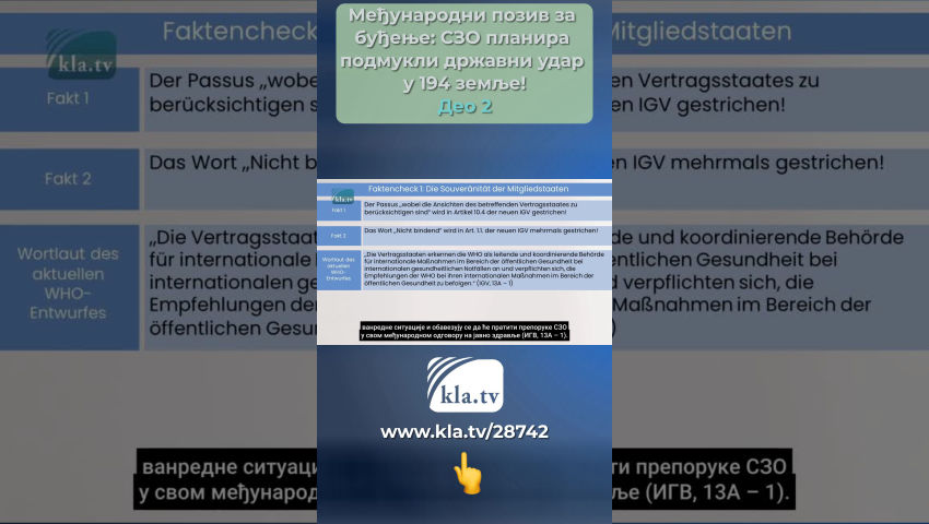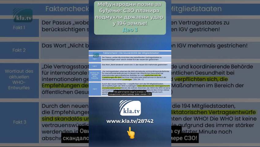 Тедрос не поштује прописе и стога није поуздан! Провера чињеница1: Суверенитет држава чланица Здравствене мере предузете на основу ових прописа, [...] морају одмах да покрену и заврше све државе уговорнице (ИХР, чл.42). Никада један човек не би требало да има таква овлашћења над животима и телима милијарди људи у 194 државе чланице СЗО! Пословни модел СЗО Гигантске финансијске трансакције које морају да плате порески обвезници одливају се у сиромашније земље и на крају завршавају у џеповима Биг Пхарма и приватних инвеститора. Ово открива колико су СЗО и њени финансијски јаки профитери подмукло припремали државни удар у 194 земље у позадини! Делегати из 194 земље чланице ће гласати о новом споразуму о пандемији и фундаменталној реформи постојећих међународних здравствених прописа на Генералној скупштини СЗО у Женеви од 27. маја 2024. до 1. јуна 2024. године. кратко: ИГВ У члану 55 ИХР-а, Тедрос се обавезује да ће свим државама чланицама саопштити текст сваког предложеног амандмана најмање четири месеца пре гласања. Ово се још није догодило од марта 2024. године, Тедрос се не придржава прописа и стога није поуздан! Наше данашње истраживање кла.тв, које су подржали међународни стручњаци, стога може само да испита тренутне нацрте два документа о којима се још увек расправља. За ово истраживање, осврћемо се на Немачку – једну од 194 државе чланице: У четвртак, 22. фебруара 2024. године, у немачком Бундестагу је представљен предлог посланичке групе ЦДУ/ЦСУ. ЦДУ/ЦСУ је највећа опозициона фракција. Она је формулисала различите захтеве за овај споразум СЗО о пандемији. Ови захтеви су упоређени у доњој провери чињеница са текстовима нацрта уговора за два споразума. Провера чињеница 1: Суверенитет држава чланица Захтеви ЦДУ/ЦСУ:: Штавише, мора се обезбедити да је примена споразума у складу са националним здравственим политикама држава чланица и да права националног суверенитета остану у потпуности нетакнута. Формулација актуелног нацрта СЗО Чињеница 1: Одломак у којем се наводи да се ставови релевантне државе уговорнице морају узети у обзир брише се из члана 10.4 новог ИХР-а! Чињеница 2: Реч необавезујућа се брише неколико пута у члану 1.1 новог ИХР-а! Државе потписнице признају СЗО као водеће и координирајуће органе за међународни одговор јавног здравља на међународне здравствене ванредне ситуације и обавезују се да ће пратити препоруке СЗО у свом међународном одговору на јавно здравље (ИГВ, 13А – 1). Чињеница 3: Новим чланом 13А – 1, 194 државе чланице СЕ ОБАВЕЗУЈУ да ће СЛЕДИТИ препоруке СЗО! Ови диктаторски нацрти уговора су скандалозни и разоткривају праве намере СЗО! СЗО није организација од поверења – чак и ако би ослабила нацрте у последњем тренутку због све већег међународног притиска! Оцена: СЗО кастрира државе чланице као скалпелом! Изостављањем или додавањем појединачних речи, она уклања њихов суверенитет и оснажује себе! Досадашње необавезујуће препоруке ће сада постати обавезна упутства за поступање по међународном праву! Провера чињеница 2: Проглашење случаја пандемије ЦДУ/ЦСУ захтева: Такође остаје нејасно да ли ће генералном директору СЗО бити дозвољено да проглашава пандемију у будућности, док он тренутно може да прогласи само ванредну здравствену ситуацију од међународног значаја која је повезана са строгим критеријумима. Формулација актуелног н