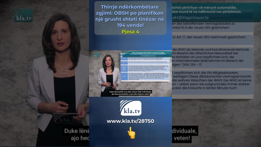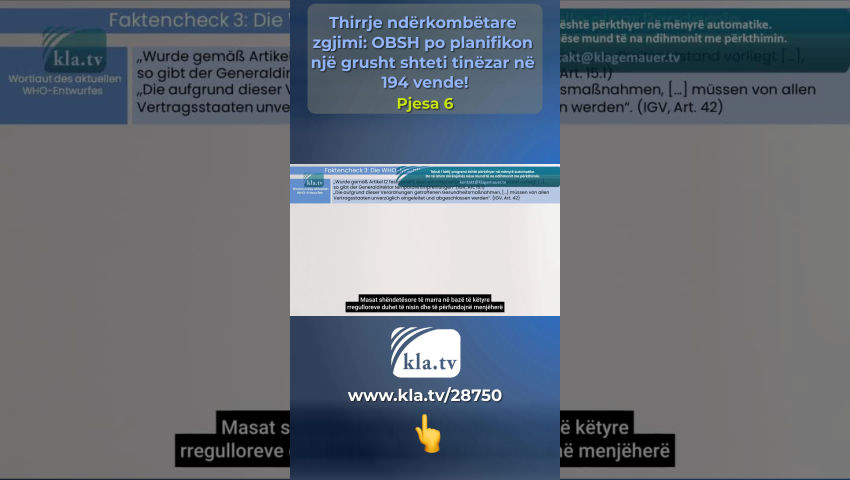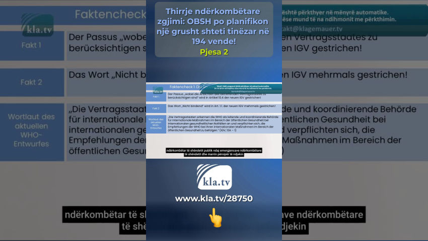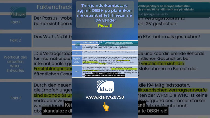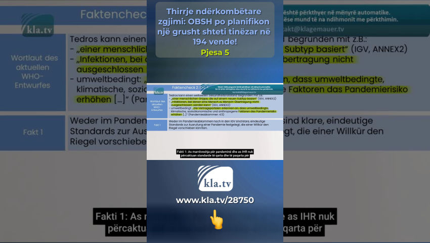 Tedros nuk ndjek rregulloret dhe për këtë arsye nuk është i besueshëm! Kontrolli i fakteve 1: Sovraniteti i Shteteve Anëtare Masat shëndetësore të marra në bazë të këtyre rregulloreve, [...] duhet të nisin dhe të përfundojnë menjëherë nga të gjitha shtetet kontraktuese (IHR, Neni 42). Asnjëherë një njeri nuk duhet të ketë një pushtet të tillë mbi jetën dhe gjymtyrët e miliarda njerëzve në 194 shtetet anëtare të OBSH-së! Modeli i biznesit i OBSH-së Transaksionet financiare gjigante që duhet të paguhen nga taksapaguesit rrjedhin në vendet më të varfra dhe përfundimisht përfundojnë në xhepat e Big Pharma dhe investitorët privatë. Kjo nxjerr në pah se sa tinëzare OBSH-ja dhe fituesit e saj të fortë financiarisht orkestruan një grusht shteti në 194 vende në sfond! Delegatë nga 194 shtete anëtare priten në Asamblenë e Përgjithshme të OBSH-së më 27 maj në Gjenevë. Një marrëveshje e re pandemike dhe një reformë thelbësore e rregulloreve ekzistuese ndërkombëtare të shëndetit do të votohet deri më 1 qershor 2024 - shkurtuar: IHR Në nenin 55 të IHR, Tedros angazhohet të komunikojë tekstin e çdo ndryshimi të propozuar për të gjitha shtetet anëtare të paktën katër muaj përpara votimit. Kjo nuk ndodhi në Mars 2024, Tedros nuk u përmbahet rregulloreve dhe për këtë arsye nuk është i besueshëm! Hulumtimi ynë i sotëm i kla.tv, i cili u mbështet nga ekspertë ndërkombëtarë, mund të ekzaminojë vetëm draftet aktuale të dy dokumenteve që aktualisht janë ende duke u diskutuar. Për këtë hulumtim, i hedhim një sy Gjermanisë – një nga 194 shtetet anëtare: Të enjten, më 22 shkurt 2024, në Bundestagun gjerman u prezantua një propozim nga grupi parlamentar CDU/CSU. CDU/CSU është fraksioni më i madh i opozitës dhe ka formuluar kërkesa të ndryshme për traktatin e pandemisë së OBSH-së. Këto kërkesa krahasohen në një kontroll fakti më poshtë me formulimin e projekt-traktateve për dy marrëveshjet. Kontrolli i fakteve 1: Sovraniteti i shteteve anëtare Kërkesa e CDU/CSU: Për më tepër, duhet të sigurohet që zbatimi i marrëveshjes të jetë në përputhje me politikat kombëtare shëndetësore të Shteteve Anëtare dhe që të drejtat e sovranitetit kombëtar të mbeten plotësisht të paprekura. Fakti 1: Paragrafi në të cilin duhet të merren parasysh pikëpamjet e Shtetit Palë përkatës është fshirë në Nenin 10.4, IHR i ri! Fakti 2: Fjala "jo-detyruese" përdoret në Nenin 1.1 dhe është fshirë disa herë në IHR-në e re! Formulimi i draftit aktual të OBSH-së Shtetet palë e njohin OBSH-në si autoritetin udhëheqës dhe koordinues për reagimin ndërkombëtar të shëndetit publik ndaj emergjencave ndërkombëtare të shëndetit dhe marrin përsipër të ndjekin rekomandimet e OBSH-së në përgjigjen e tyre ndërkombëtare të shëndetit publik (IHR, 13A – 1). Fakti 3: Me nenin e ri 13A – 1, 194 shtete anëtare ANGAZHOHEN të NDJEKIN të gjitha rekomandimet e OBSH-së! Këto projekt-traktate diktatoriale janë skandaloze dhe ekspozojnë qëllimet e vërteta të OBSH-së! OBSH nuk është një organizatë e besueshme - edhe nëse do të dobësonte draftet në minutën e fundit për shkak të rritjes së presionit ndërkombëtar! Vlerësimi: OBSH tredh shtetet anëtare sikur të përdorte një bisturi! Duke lënë jashtë ose duke shtuar fjalë individuale, ajo heq sovranitetin e tyre dhe fuqizon veten! Rekomandimet e mëparshme jodetyruese tani do të bëhen udhëzime të detyrueshme për veprim sipas ligjit ndërkombëtar! Kontrolli i fakteve 2: Shpallja e një pandemie Kërkesa e CDU/CSU: Mbetet gjithashtu e paqartë nëse Drejtori i Përgjithshëm i OBSH-së do të lejohet të shpallë pandemi në të ardhmen, ndërsa ai aktualisht mund të deklarojë vetëm një emergjencë shëndetësore me shqetësim ndërkombëtar që lidhet me kritere strikte. Fjalimi i draftit aktual të OBSH-së: Tedros mund të krijojë një emergjencë shëndetësore globale me p.sh.: - një grip njerëzor bazuar në një nëntip të ri (IHR, ANEKS2) ose - Infeksionet në të cilat transmetimi nga njeriu te njeriu nuk mund të përjashtohet (SHTOJCA 2 i IHR) apo edhe i lidhur me mjedisin: - Palët pranojnë se faktorët mjedisorë, klimatikë, socio-ekonomikë dhe antropogjenë rrisin rrezikun e pandemisë (Marrëveshja Pandemike 4.5). Fakti 1: As marrëveshja për pandeminë dhe as IHR nuk përcaktuan standarde të qarta dhe të paqarta për shpalljen e një pandemie që mund t'i ndalte arbitraritetin. Fakti 2: Sipas nenit të ri 12, paragrafi 5 dhe paragrafi 1 i IHR, Drejtori i Përgjithshëm Tedros mund të shpallë edhe pandemi në të ardhmen! Vlerësimi: Amendamenti i IHR dhe traktati i pandemisë i japin Sekretarit të Përgjithshëm carte blanche për të shpallur një pandemi, e cila nuk është e lidhur me asnjë kriter të matshëm! Kontrolli i fakteve 3: Kompetencat e OBSH-së në rast të një pandemie Kërkesa e CDU/CSU: OBSH duhet të bëhet më e aftë për të vepruar përmes një marrëveshjeje pandemike, ku fuqitë e saj të përcaktohen qartë dhe roli qendror i shteteve anëtare të mbrohet gjithashtu si të drejtat të qytetarëve . Formulimi i draftit aktual të OBSH-së Nëse një emergjencë ndërkombëtare e shëndetit publik është përcaktuar në përputhje me nenin 12 […], Drejtori i Përgjithshëm do të nxjerrë rekomandime të përkohshme (IHR, Neni 15.1) Masat shëndetësore të marra në bazë të këtyre rregulloreve duhet të nisin dhe të përfundojnë menjëherë nga të gjitha shtetet kontraktuese. (IHR, Neni 42). Fakti 1: Duke shpallur një pandemi, Sekretari i Përgjithshëm i OBSH-së i jep vetes pushtet. Vlerësimi: Në rast të një pandemie, të dyja marrëveshjet e OBSH-së nuk parashikojnë një përcaktim të qartë të kompetencave të Drejtorit të Përgjithshëm Tedros! Asnjëherë një njeri nuk duhet të ketë një pushtet të