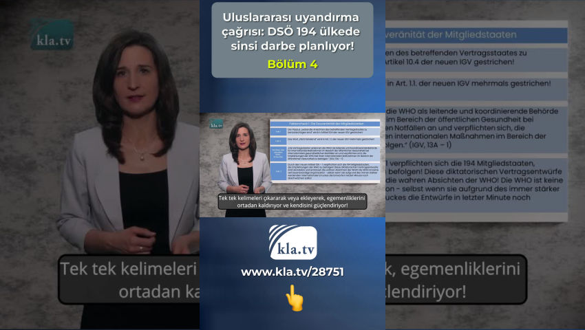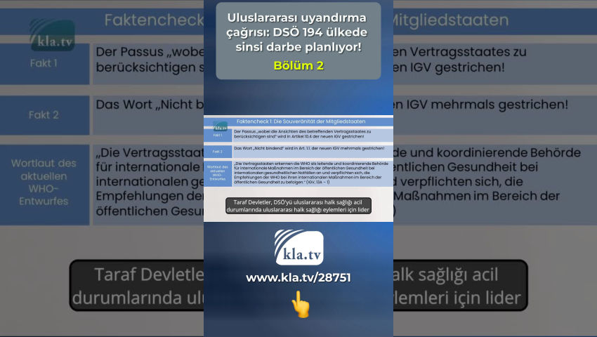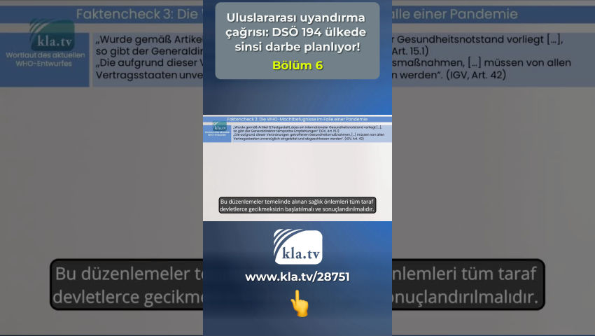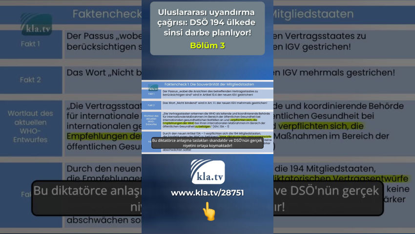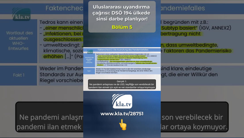 Tedros düzenlemelere uymuyor ve bu nedenle güvenilir değildir! Gerçek kontrolü1: Üye Devletlerin egemenliği Bu düzenlemelere dayanarak alınan sağlık önlemleri, [...] tüm sözleşmeci devletler tarafından derhal başlatılmalı ve tamamlanmalıdır (USD (Uluslararası sağlık düzenlemeleri), Madde 42). Dünya Sağlık Örgütü'nün 194 üye ülkesindeki milyarlarca insanın hayatı ve uzuvları üzerinde asla bir adam böyle bir güce sahip olmamalıdır! DSÖ iş modeli Vergi mükellefleri tarafından ödenmesi gereken devasa mali işlemler, daha fakir ülkelere akıyor ve sonuçta Büyük İlaç Firmalarının ve özel yatırımcıların cebine giriyor. Bu, DSÖ'nün ve mali açıdan güçlü vurguncularının arka planda 194 ülkede ne kadar sinsice bir darbe planladığını gün ışığına çıkarıyor! 194 üye ülkeden delegeler, 27 Mayıs - 1 Haziran 2024 tarihleri arasında Cenevre'deki DSÖ Genel Kurulunda yeni bir salgın anlaşması ve mevcut Uluslararası Sağlık Tüzüğünde temel bir reform yapılması için oy kullanacak - kısacası: USD USD'nin 55. Maddesinde Tedros, önerilen herhangi bir değişiklik metnini oylamadan en az dört ay önce tüm üye devletlere iletmeyi taahhüt etmektedir. Bu Mart 2024'e kadar yapılmadı, Tedros düzenlemelere uymaz ve bu nedenle güvenilir değildir! Bugün uluslararası uzmanlar tarafından desteklenen kla.tv araştırmamız, bu nedenle sadece halen tartışılmakta olan iki belgenin mevcut taslaklarını inceleyebilmektedir. Bu araştırma için 194 üye ülkeden biri olan Almanya'ya göz atıyoruz: 22 Şubat 2024 Perşembe günü Alman Federal Meclisi'nde CDU/CSU parlamento grubu tarafından bir önerge sunuldu. CDU/CSU en büyük muhalefet grubudur ve DSÖ pandemi anlaşması için çeşitli talepler formüle etmiştir. Bu talepler, aşağıdaki doğruluk kontrolünde iki anlaşmaya ilişkin taslak anlaşmaların metniyle karşılaştırılmaktadır. Gerçek kontrolü 1: Üye Devletlerin egemenliği CDU/CSU'nun talebi: Ayrıca anlaşmanın uygulanmasının Üye Devletlerin ulusal sağlık politikalarına uygun olması ve ulusal egemenlik haklarının tam anlamıyla korunması sağlanmalıdır. Gerçek 1: İlgili sözleşmeci devletin görüşlerinin dikkate alınması gereken paragraf yeni UST'nin 10.4 maddesinden silinecektir! Gerçek 2: Yeni UST'nin 1.1. maddesinde bağlayıcı olmayan kelimesi birkaç kez silinmiştir! Mevcut DSÖ taslağının üslubu Taraf Devletler, DSÖ'yü uluslararası halk sağlığı acil durumlarında uluslararası halk sağlığı eylemleri için lider ve koordinatör otorite olarak kabul eder ve uluslararası halk sağlığı eylemlerinde DSÖ tavsiyelerine uymayı taahhüt eder (USD, 13A - 1). Gerçek 3: Yeni Madde 13A - 1 194 Üye Devlete DSÖ tavsiyelerine UYMA TAAHHÜDÜ VERMEKTEDİR! Bu diktatörce anlaşma taslakları skandaldır ve DSÖ'nün gerçek niyetini ortaya koymaktadır! DSÖ güvenilir bir kuruluş değil - sürekli artan uluslararası baskı nedeniyle taslakları son dakikada zayıflatmış olsa bile! Rating: DSÖ üye devletleri bir neşter gibi iğdiş etmektedir! Tek tek kelimeleri çıkararak veya ekleyerek, egemenliklerini ortadan kaldırıyor ve kendisini güçlendiriyor! Önceki bağlayıcı olmayan tavsiyeler böylece uluslararası hukuk kapsamında bağlayıcı talimatlar haline gelecektir! Gerçek kontrolü 2: Pandemi ilanı CDU/CSU'nun talebi: Ayrıca DSÖ Genel Direktörünün gelecekte pandemi ilan etmesine izin verilip verilmeyeceği de belirsizliğini koruyor, halbuki kendisi şu anda yalnızca katı kriterlere bağlı, uluslararası öneme sahip bir sağlık acil durumu ilan edebiliyor. Mevcut DSÖ taslağının ifadesi: Tedros, küresel bir sağlık acil durumunu örneğin aşağıdakilerle gerekçelendirebilir: - yeni bir alt tipe dayalı bir insan gribi (USD, EK2) veya - insandan insana bulaşmanın göz ardı edilemediği enfeksiyonlar (USD, EK2) veya hatta çevresel: - Taraflar çevresel, iklimsel, sosyo-ekonomik ve antropojenik faktörlerin pandemi riskini arttırdığını kabul ederler (Pandemi Anlaşması 4.5). Gerçek 1: Ne pandemi anlaşması ne de USD, keyfiliğe son verebilecek bir pandemi ilan etmek için açık ve net standartlar ortaya koymuyor. Gerçek 2: USD'nin yeni 12. Maddesi, 5. Paragrafı ve 1. Paragrafına göre, Genel Direktör Tedros gelecekte pandemi bile ilan edebilir! Rating: USD'de yapılan değişiklik ve pandemi anlaşması, Genel Sekretere herhangi bir ölçülebilir kritere bağlı olmayan bir pandemi ilan etme yetkisi vermektedir! Gerçek kontrolü 3: Bir pandemi durumunda DSÖ'nün yetkileri CDU/CSU'nun talebi: DSÖ, yetkilerinin net bir şekilde tanımlandığı ve üye devletlerin merkezi rolü ile vatandaşların haklarının doğal olarak korunduğu bir pandemi anlaşması yoluyla hareket etme konusunda daha yetenekli hale gelmelidir. Mevcut DSÖ taslağının ifadesi Madde 12 uyarınca uluslararası bir halk sağlığı acil durumunun mevcut olduğunun tespit edildiği hallerde [...], Genel Direktör geçici tavsiyeler yayınlar (USD, Madde 15.1) Bu düzenlemeler temelinde alınan sağlık önlemleri tüm taraf devletlerce gecikmeksizin başlatılmalı ve sonuçlandırılmalıdır. (USD, Madde 42). Gerçek 1: DSÖ Genel Sekreteri pandemi ilan ederek kendisini yetkilendirmektedir. Değerlendirme: Bir pandemi durumunda, DSÖ anlaşması Genel Direktör Tedros'un yetkilerinin net bir şekilde sınırlandırılmasını öngörmemektedir! DSÖ'nün 194 üye ülkesindeki milyarlarca insanın yaşamı ve uzuvları üzerinde bir kişiye asla böyle yetkiler verilmemelidir! Gerçek kontrolü 4: Geniş tabanlı bir kamusal tartışma ihtiyacı CDU/CSU'nun talebi: Başvuru sahipleri, bilim, iş dünyası, sivil toplum ve parlamentoları içeren bir pandemi anlaşmasının hedefleri ve içeriği konusunda geniş bir kamuoyu tartışmasına duyulan ihtiyacı vurgulamaktadır. Mevcut DSÖ taslağının ifadeleri Küresel