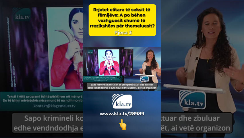 Aktori i njohur Tom Hanks dikur tha me besim në kamera: "Pjesa më e mirë për t'u parë si djali më miqësor në Hollywood është se askush nuk po kërkon trupa të vdekur në oborrin e shtëpisë time." Ishte budallallëk, por ka ardhur koha! Tani janë bërë të njohura shumë deklarata të dëshmitarëve që kanë treguar për "kufoma të tilla në oborrin e shtëpisë". Konsideroni Isaac Kappy, videot ekspozuese të të cilit ende qarkullojnë nëpër botë edhe pse ai "vdiq" shumë kohë më parë, siç mund të shihet në dokumentarin tim Blood Sect 1 [www.kla.tv/24000]. Ai jo vetëm zbuloi abuzimin e fëmijëve që përjetoi vetë në duart e Tom Hanks dhe Steven Spielberg, por edhe shumë, shumë më tepër… Në muajt e fundit, unë dhe një ekip redaktues kemi publikuar disa hulumtime shpërthyese në Kla.TV për këtë temë, e cila ka arritur rreth nëntë milionë shikime [www.kla.tv/27211, 26203, 26810, 26202, 26577]. Po flasim për abuzimin e pamëshirshëm, ritual mbarëbotëror të fëmijëve - përfshirë torturën dhe vrasjen - që është dëshmuar qindra herë dhe po del gjithnjë e më shumë në dritë. [Allie, SHBA]: "Dhe gjatë punës sime duke përfaqësuar viktimat, kam takuar disa individë që kanë qenë viktima të abuzimit ritual satanik." [Philippa, Zelanda e Re]: «Isha dëshmitar dhe duhej të merrja pjesë në sakrifica rituale. U detyrova të pi gjak kurban dhe të ha mish të gatuar.” [Mary Sparrow, SHBA]: “Si pjesë e grupit ritual që kishin këta njerëz, pashë fëmijë duke u vrarë. Dhe pashë foshnjat duke u vrarë. Dhe ata praktikuan një formë gjakpirjeje dhe kanibalizmi si pjesë e fesë së tyre.” [Doug, Australi]: "Dhe para se t'ju detyrojnë të vrisni një person tjetër ose një fëmijë tjetër, ata ju bashkojnë me fëmijën në mënyrë që të krijoni një lidhje emocionale, në mënyrë që trauma të përkeqësohet edhe më shumë." [Sue, SHBA]: “Kështu që ata bënë simbolet e tyre, unë u drogova, isha si një kukull lecke që më shpërndanin dhe më përdhunuan. Një herë tjetër ishin me dhjetëra. Më kujtohet gjithashtu një kamping ku dogjën një fëmijë të moshës sime në një pirg.” [Christine, SHBA]: “…dhe shihni një grup njerëzish të veshur me rroba duke ecur në një rrugë duke brohoritur, “Bir i Satanait, vrite foshnjën”. (…) Procesioni ndalet në një altar jashtë në pyll. Dhe monsinjori sakrifikon foshnjën.” [Ron Alan, SHBA]: “MK Ultra, SRA [abuzimi ritual satanik], është e gjitha pjesë e një përpjekjeje shumë të madhe që po ndodh. Ndodh në prapaskenë dhe nuk flitet shumë për të.” [Diana, SHBA]: “Më kujtohet se më kanë fluturuar në vende të ndryshme. Zona 51, Universiteti Stanford, Pylli i Zi në Gjermani dhe, siç thashë, Westminster Abbey dhe Instituti Tavistock, tunelet nëntokësore në Londër, Angli. Unë gjithashtu linda binjakë në ndërtesën Skull and Bones në Universitetin Yale. Shumë tortura të ndryshme u kryen para, gjatë dhe pas shtatzënive dhe lindjeve..." [Eva Frey, Zvicër]: “... herën e dytë, kur foshnja do të lindte, më rrëmbyen në kalime të nëndheshme dhe më torturuan për të lindur fëmijën. (…) Ata e lanë këtë foshnjë të jetojë për disa ditë dhe më pas e hodhën në mur përballë meje (…) dhe më pas e torturuan këtë foshnjë para meje.” [Gloria Masters, Zelanda e Re]: "Më kujtohet se kam dëgjuar fjalët: "Ajo është shumë e vjetër".Dhe kështu ata morën një djalë që ishte pak më i ri se unë dhe ai u flijuanë vend të tij.”